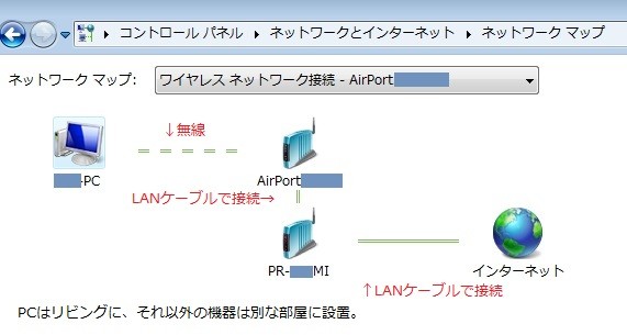 私はリビングでPCを使っている。しかし無線LANルーター(図のAirPort**)は、トイレの前を通って玄関側の別な部屋にある(といってもわからないだろうけど)。