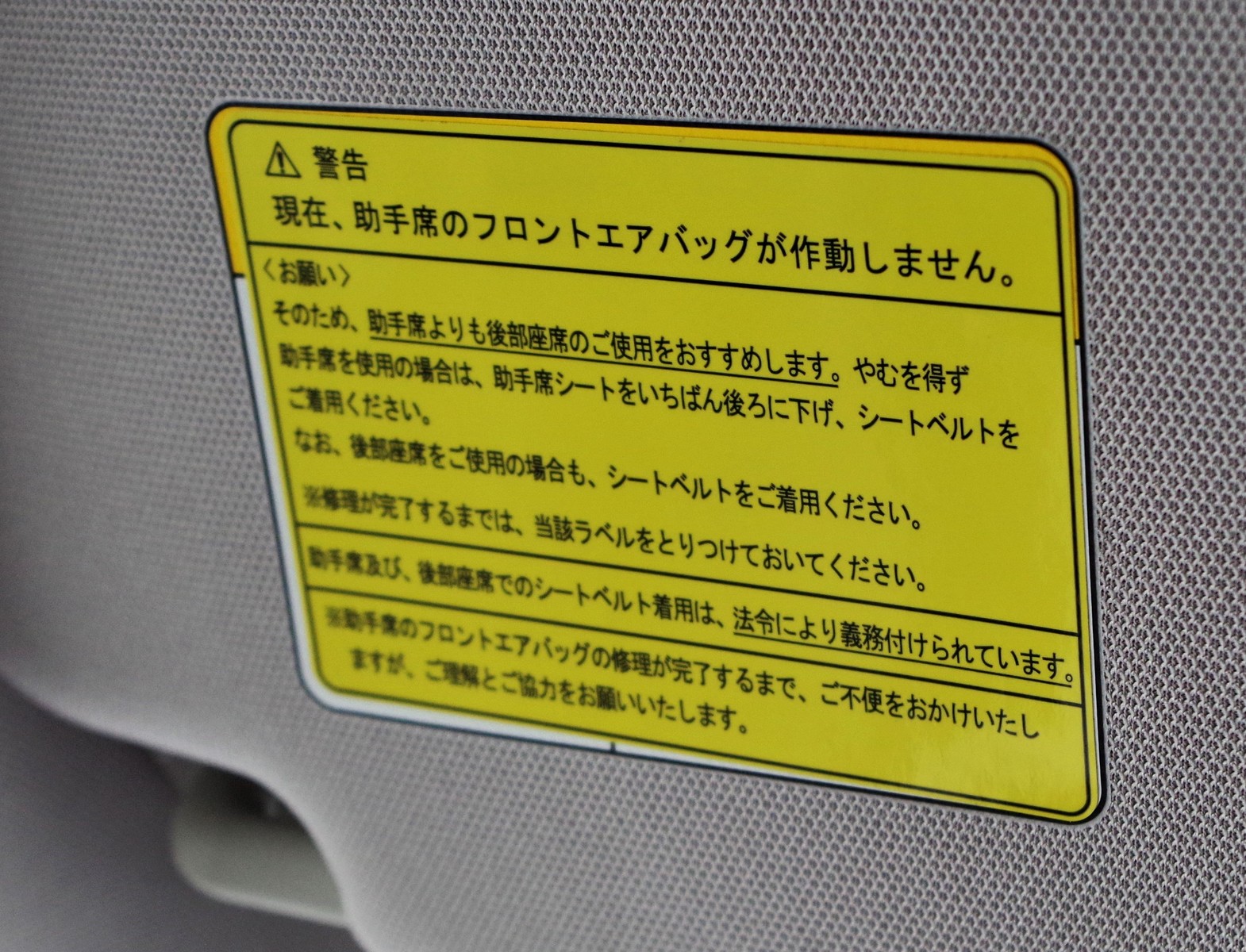 すでに順次新しいエアバッグと交換しているという。だから、私はそのまま新しいものに交換してくれるのではと淡い期待を抱いたが、先に機能停止処置をした人から順に交換しているそうで、淡い期待は濃くならなかった。私だって横入りのようなことはしたくない。喜んで、今さらながら問題あるエアバッグの息の根を止めるという作業だけでがまんすることにした。