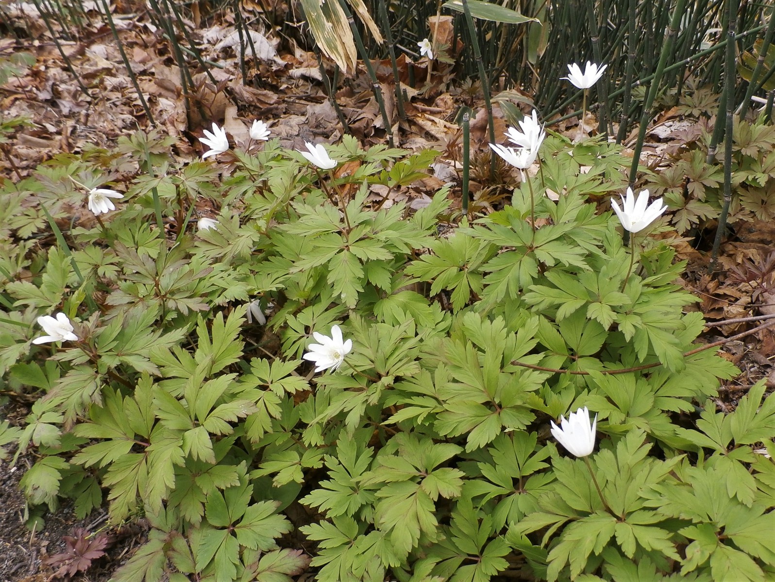 もう5月になろうとしているのに食事を終えて、昭和新山をかすめ-見た目もかすんでいた。PM2.5のせいだ-洞爺湖畔の道端でキクザキイチゲが集落を作って花盛りなのに気づき、車を停めて撮影。