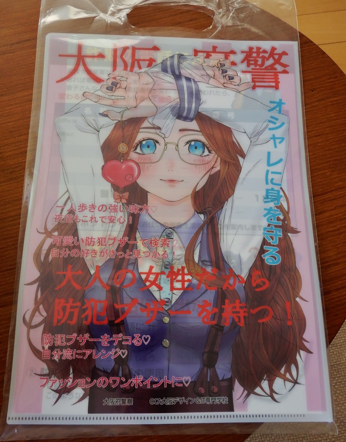 女性といえば、大阪府警が駅前で上の写真のクリアファイルを配っていた。