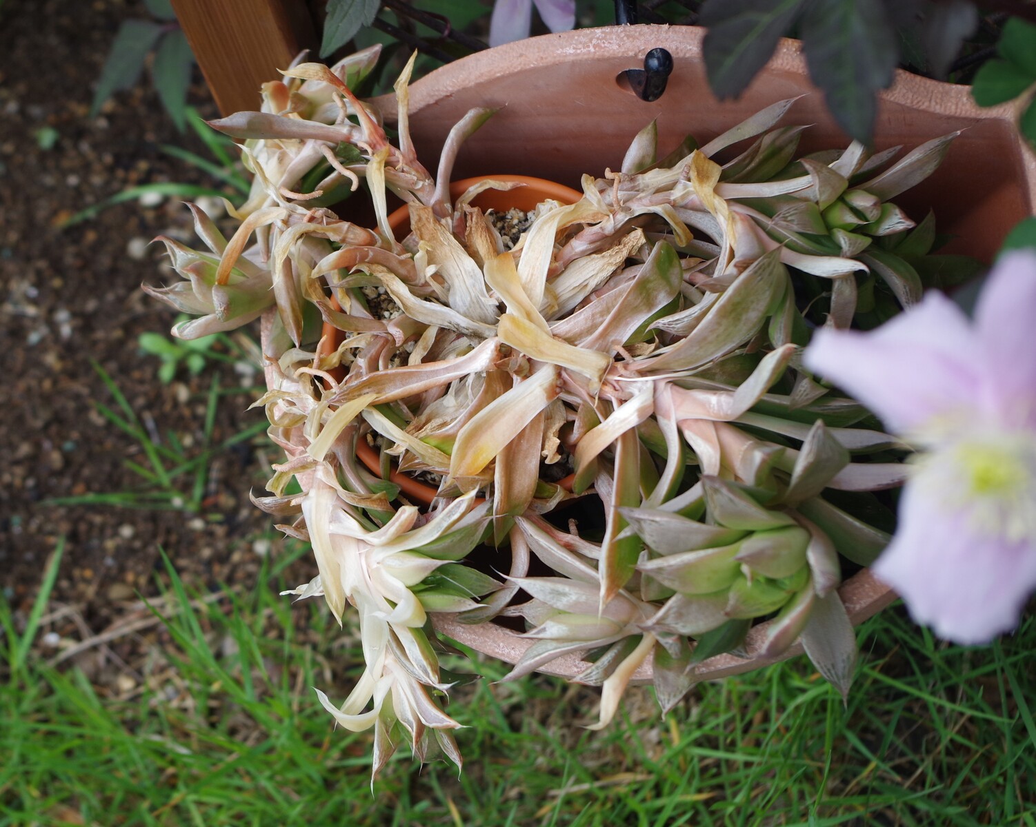 そして、このとき外に出したハオルチアは、日焼けなのか何なのかわからないが、とっても無残な姿になっている。環境に慣れたら、また美しい緑色になるのだろうか?