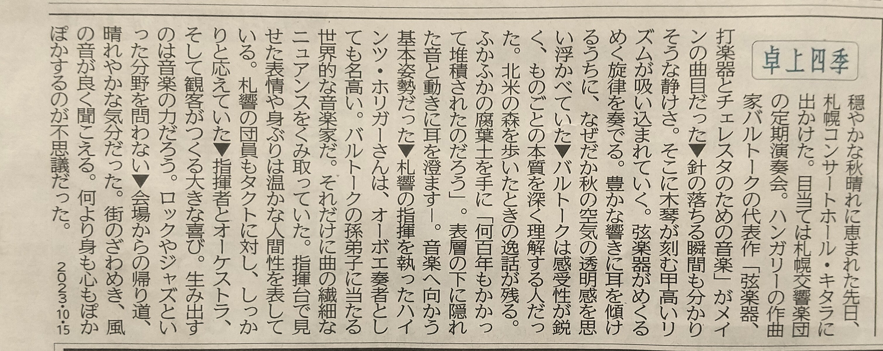 私は行けなかったが-って、億劫がってもう何年も札響の定期演奏会に足を運んでいないのだが-先日の10月7日と8日の両日行なわれた札幌交響楽団の第656回定期演奏会のバルトークは(いや、きっと『バルトーク以外も』だろう)すばらしい演奏だったようだ。