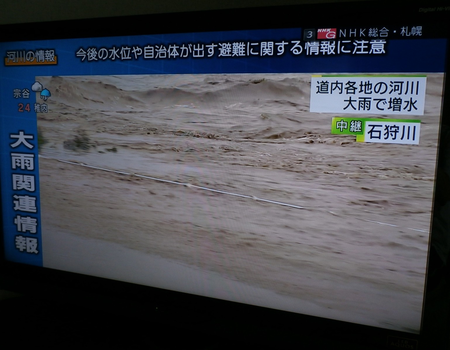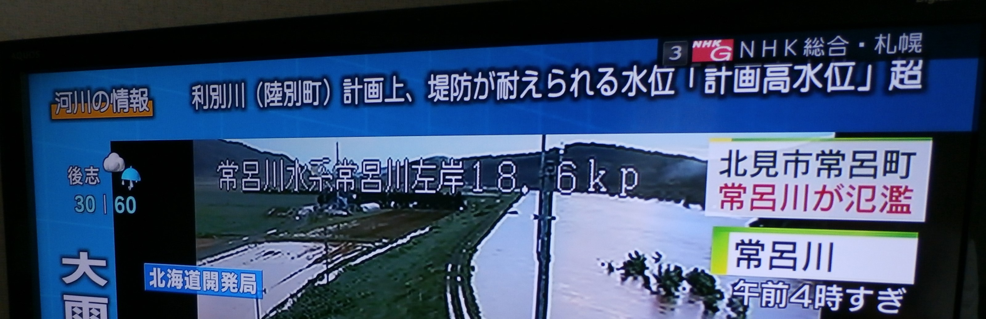 折しも、常呂川が氾濫。だが、画面の“多いところ”の“ところ”は常呂ではない。全道が範囲なのだ。