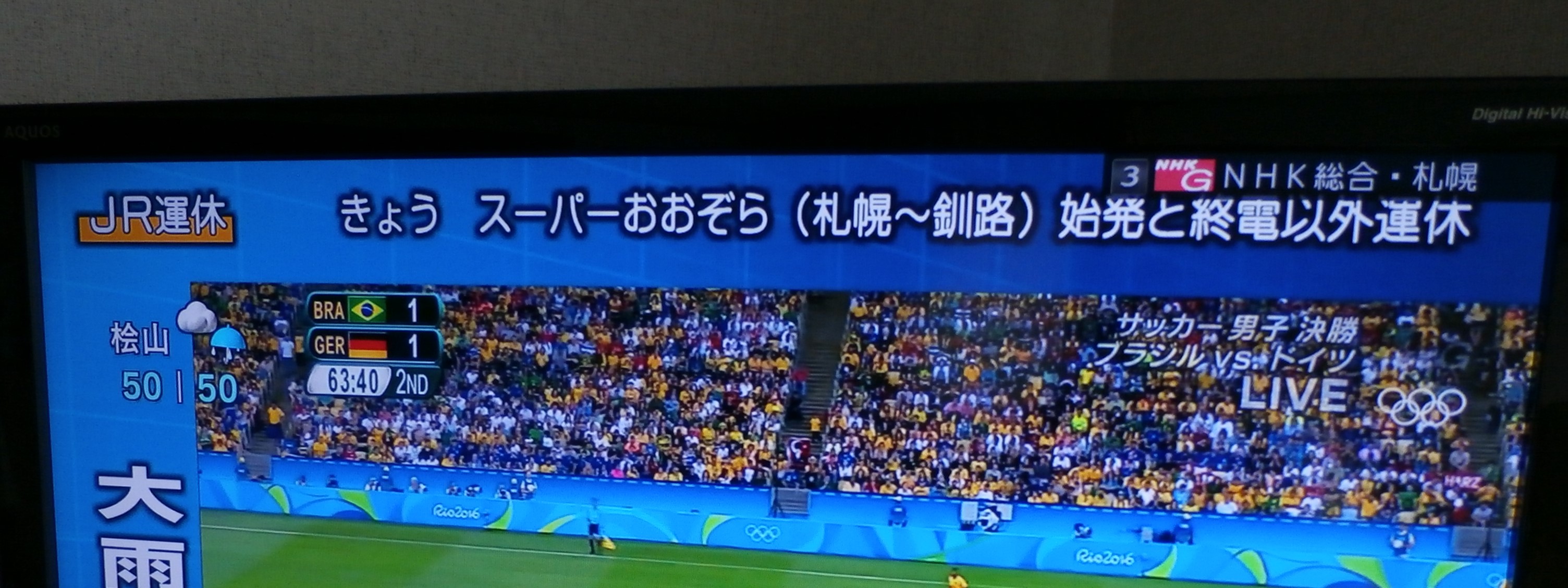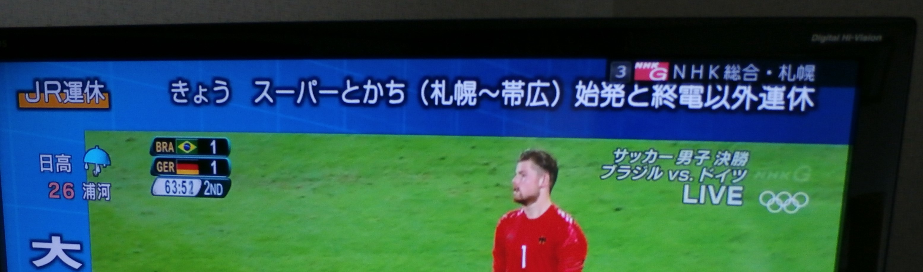 そんなわけで、ちょうどブラジルとドイツのサッカーの試合が終わったあとに-こういう気遣いは大切である-疎菜課長に電話をして、「防災のため今日戻るのを断念する。間違っても北海高校の決勝戦をテレビで観たいからじゃない。そうそう、明日は名古屋が台風の影響を受けないよう策を講じるように」と、窮状を訴えた上に無理難題を言い、強引に納得させたあと、飛行機の解約と新規予約をした。