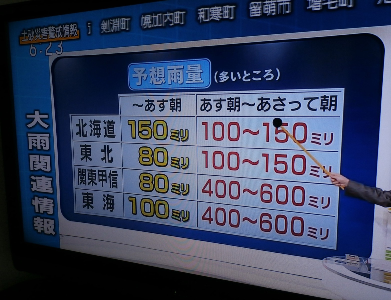 でも、こういうときはやっぱりNHKが頼りになる。月曜の朝までに150ミリ、月曜の朝から火曜日の朝までも150ミリ降るという予想だ。
