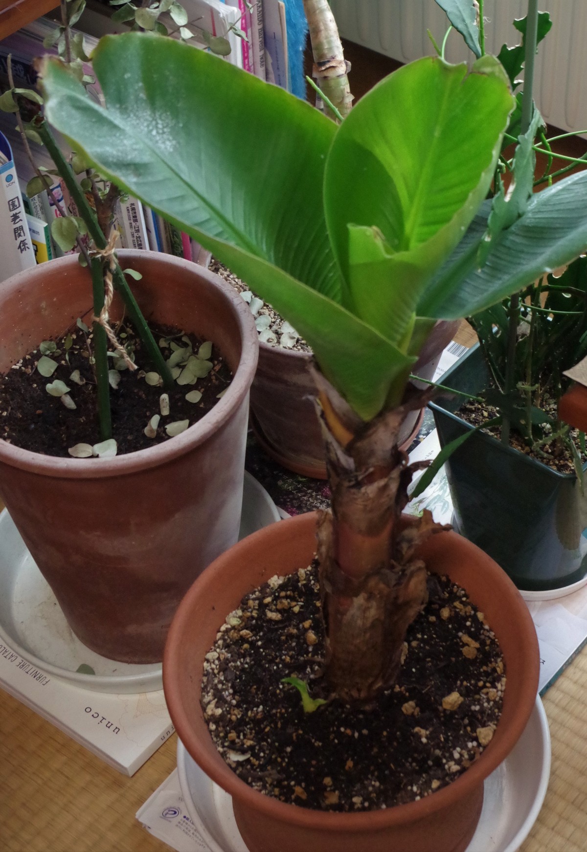 部屋の中では、ちょいと汚らしい様相だが、モンキーバナナが順調に育っている。
