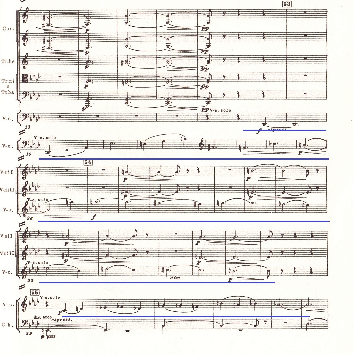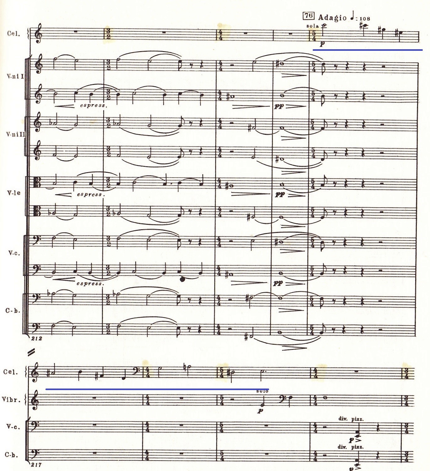 第2楽章の終わりの方のチェレスタのメロディー、つまりチェロ独奏の反行型というのがこれ。私は100%は理解できていないけど。