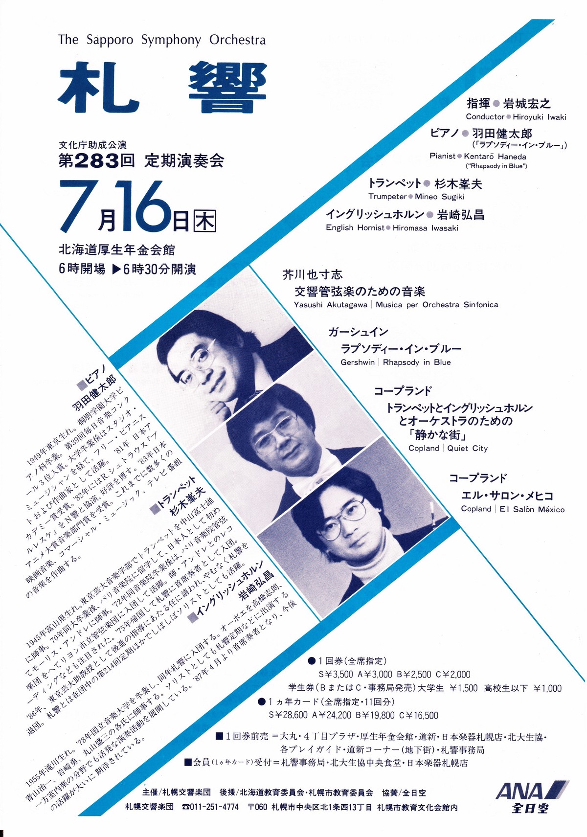これまでの“感動史”の流れからは時代がとぶが-でも、年を追ってなんて一言も言ってないもんね-札幌交響楽団第283回定期演奏会(1987年7月16日)で、音楽監督・岩城宏之がプログラムの1曲目でこの曲を取り上げた(この日のような構成のプログラムも、岩城時代になってから、ときおり組まれるようになったものだ。なお、この日は当日になって、バーバーの「弦楽のためのアダージョ」が追加され、3曲目に演奏された)。