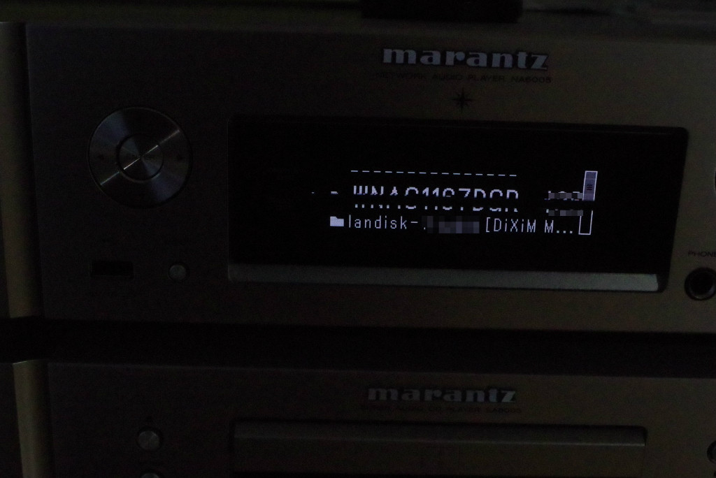NA6005のリモコンの『MUSIC SERVER』ボタンを押して(写真1枚目)、さらに方向キー▶を押すと、1行目にルーターの『WN-AC1167DGR3』の名前が表示された(写真2枚目)。2行目には小さくNASである無線LAN ディスクの名前も表示されているので、方向キー▼でそれをメイン表示(写真3枚目)。決定ボタンを押したあと、方向キー▼を何度か押し、『ミュージック』、さらに『フォルダ』を選ぶ(写真4~5枚目)。すると『disk2』の中に保管されている『作曲家名』のフォルダーが表示された。あとは方向キー(▶と▼)と決定キーを押しながら、『ジャンル』『作品名』『演奏者名』のフォルダーへと辿っていき(写真6~8枚目)、無事、曲を再生することができた。