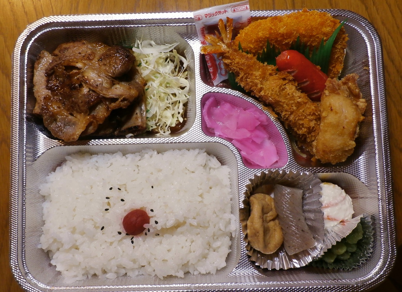 しょうが焼きの他にも、唐揚げ、エビフライ、赤いウインナーなどが入っていて、これはもう、大人のためのお子様ランチワールドだ。