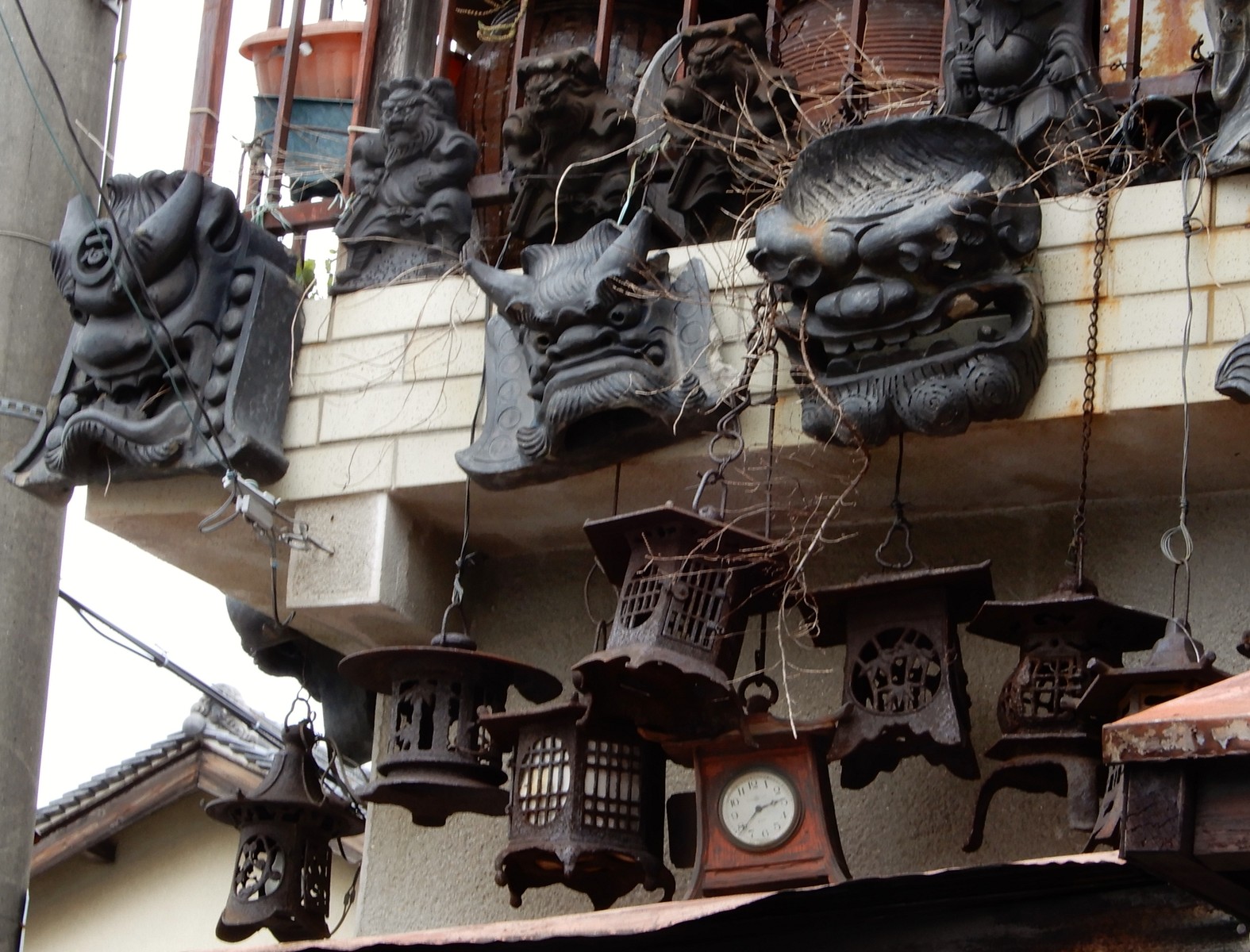 玄関-買受センターの入口というよりは一般住宅の玄関のようだ-の上には、こわ~いお顔に、たくさんのぶら下がりもの(吊り灯篭っていうのだろうか?)が。