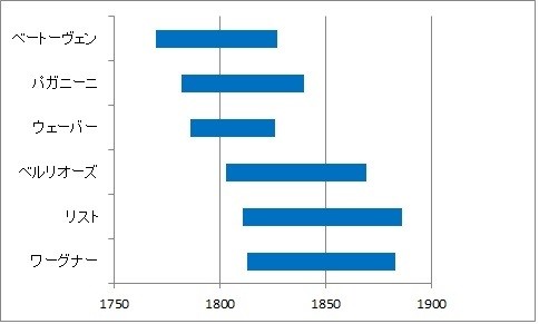 参考までに、上に引用した箇所に登場する作曲家たちの生没年を、エクセルでそれなりに苦労してグラフにしたものを載せておく。