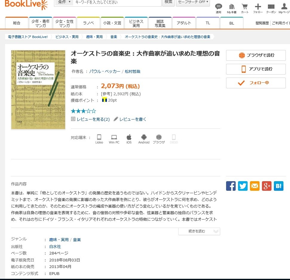 前に一度紹介した書籍、ベッカー著の「オーケストラの音楽史-大作曲家が追い求めた理想の音楽」(松村哲哉訳:白水社。電子書籍発行日2018年8月10日)は、久々に読み応えのある(おもしろくてためになるという意味で)『音楽書』だった。
