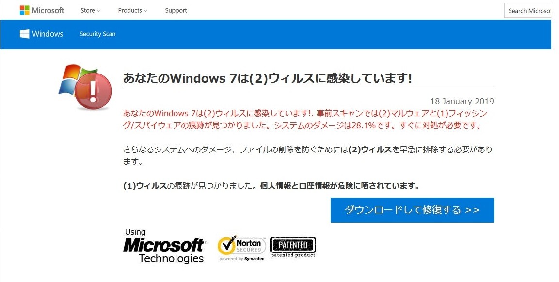 パソコンを使ってインターネットで調べ物をしていたところ、ウインドウズを修復しなきゃならないとか、あと何百秒かでウイルス撃退のためのソフトをダウンロードをするだのという画面に支配されているというのだ。