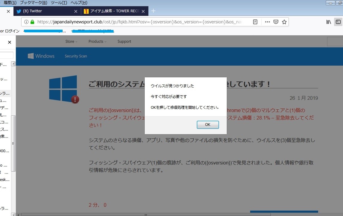 数日前もその日とは別の、でも言ってることはほぼほぼ同じ画面に支配されたが、そのときは X をクリックして消せた。ところが、今回は X をクリックしても無反応。無反応どころか次々と新しい画面が出てくるという。
