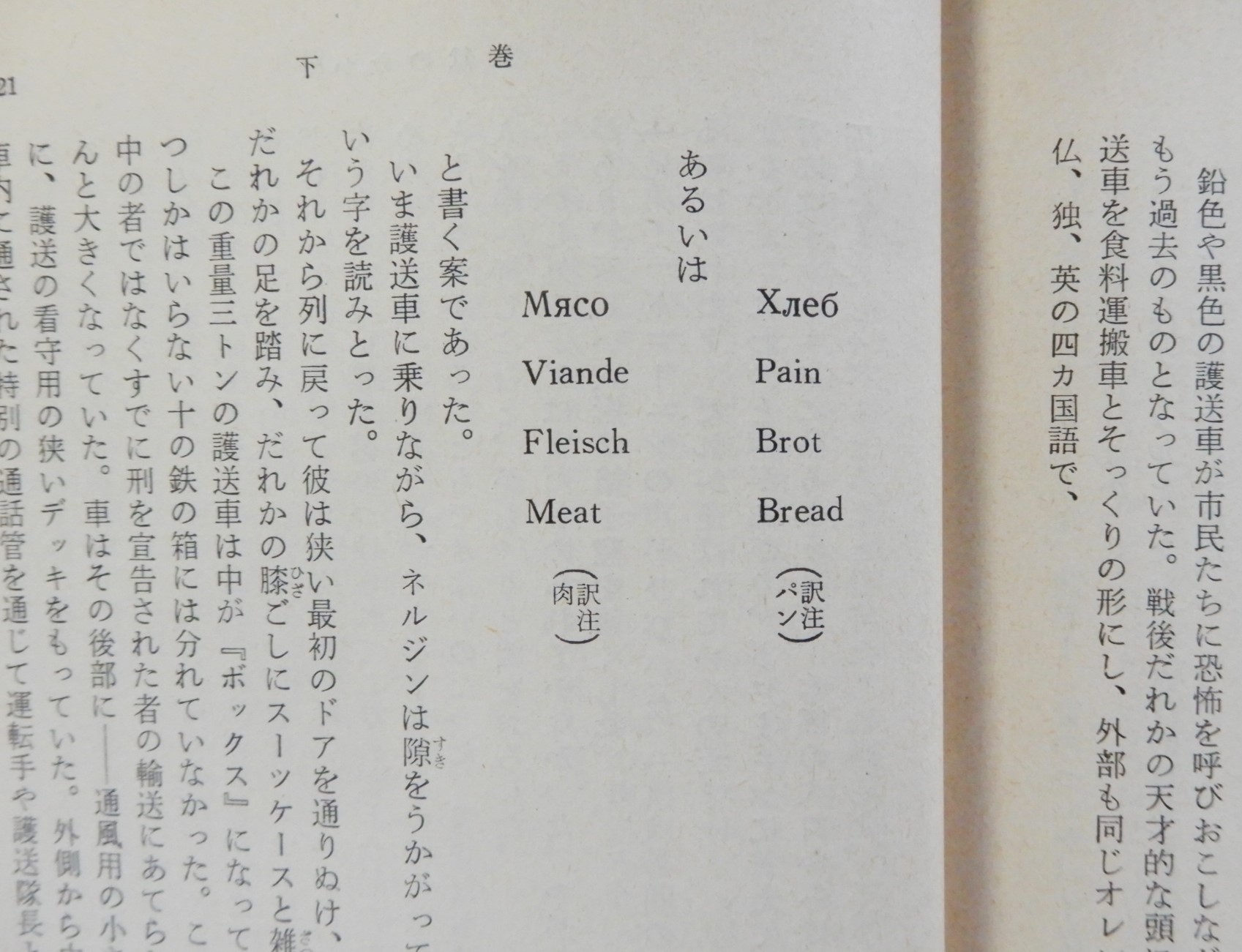 鉛色や黒色の護送車が市民たちに恐怖を呼びおこしながら町の通りを走りまわっていた時代はもう過去のものとなっていた。戦後だれかの天才的な頭に名案がうかんだのだった。つまり、護送車を食料運搬車とそっくりの形にし、外部も同じオレンジ色と空色の縞模様に塗り、そこに露、仏、独、英の四カ国語で〔パン〕あるいは〔肉〕と書く案であった。 いま護送車に乗りながら、ネルジンは隙をうかがってわきへととび出し、そこから《Meat》という字を読みとった。