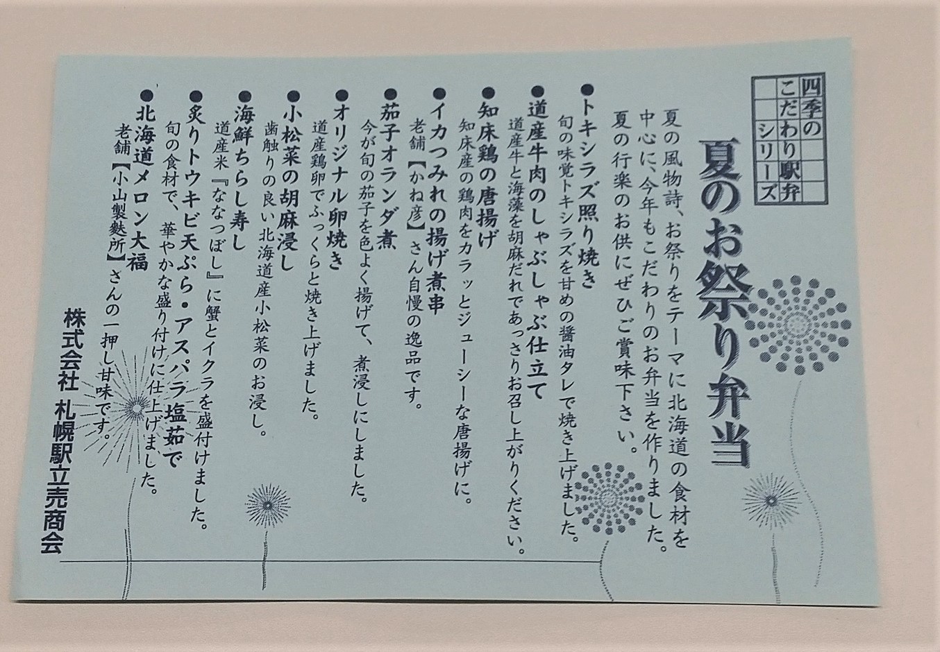 そんななか、木曜日に私が買った弁当は期間限定の「夏のお祭り弁当」。弁菜亭(札幌駅立売商会)が作っている駅弁である。税込1,000円。奮発しちゃった。だって、お盆前だから(←意味不明)。