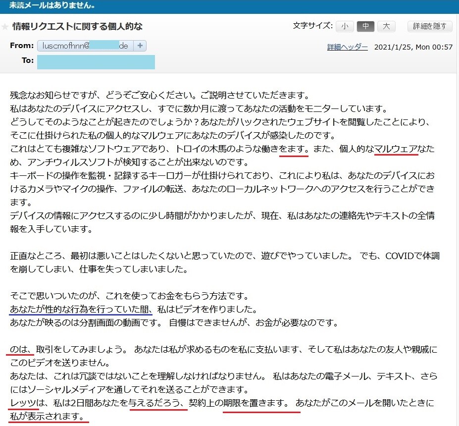 そもそも青のアンダーラインを引いたところに関しては(ここが脅迫のキモってことになるのだが)、どこの誰のいつの話ってくらい、私には縁のないことなのである。