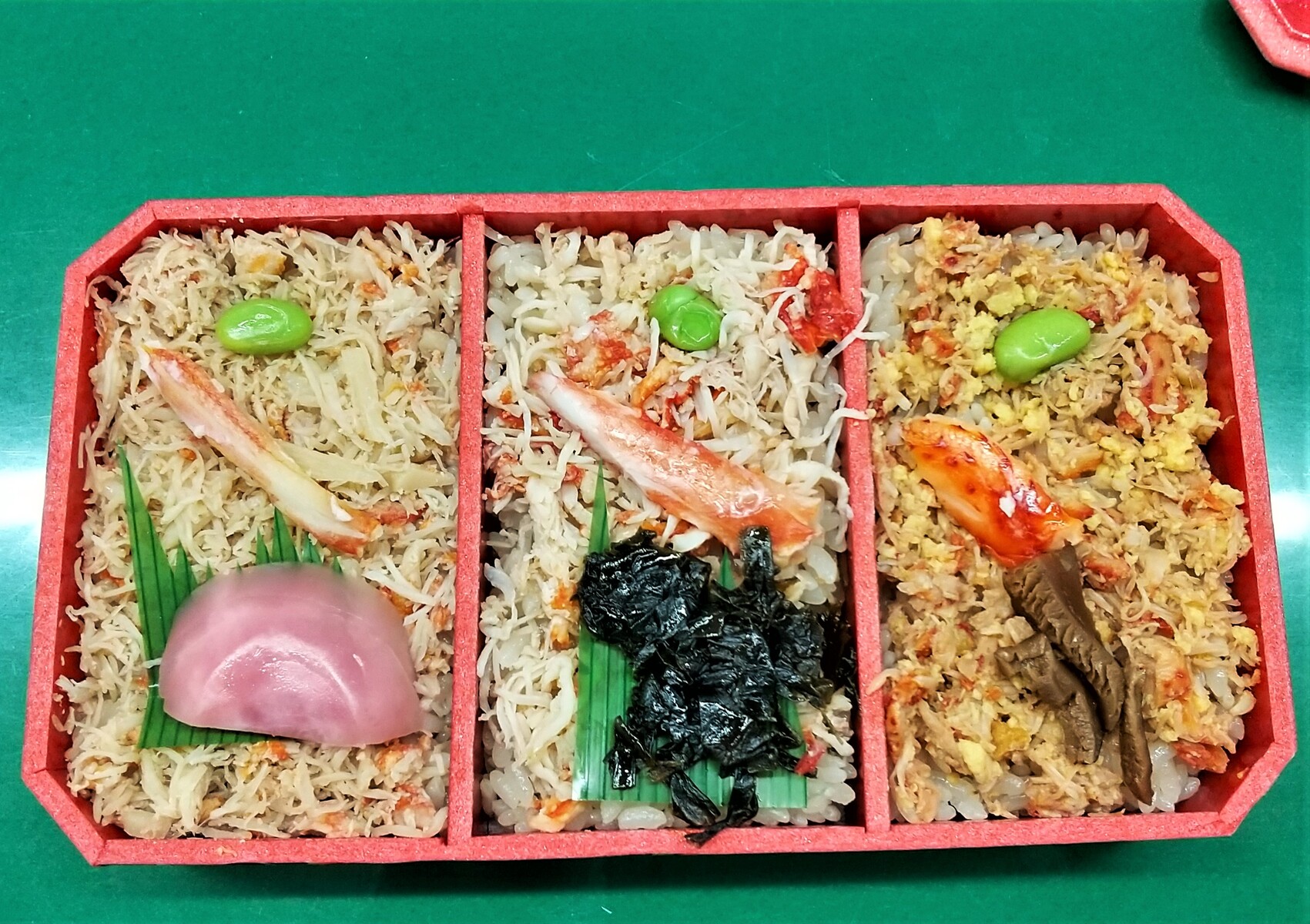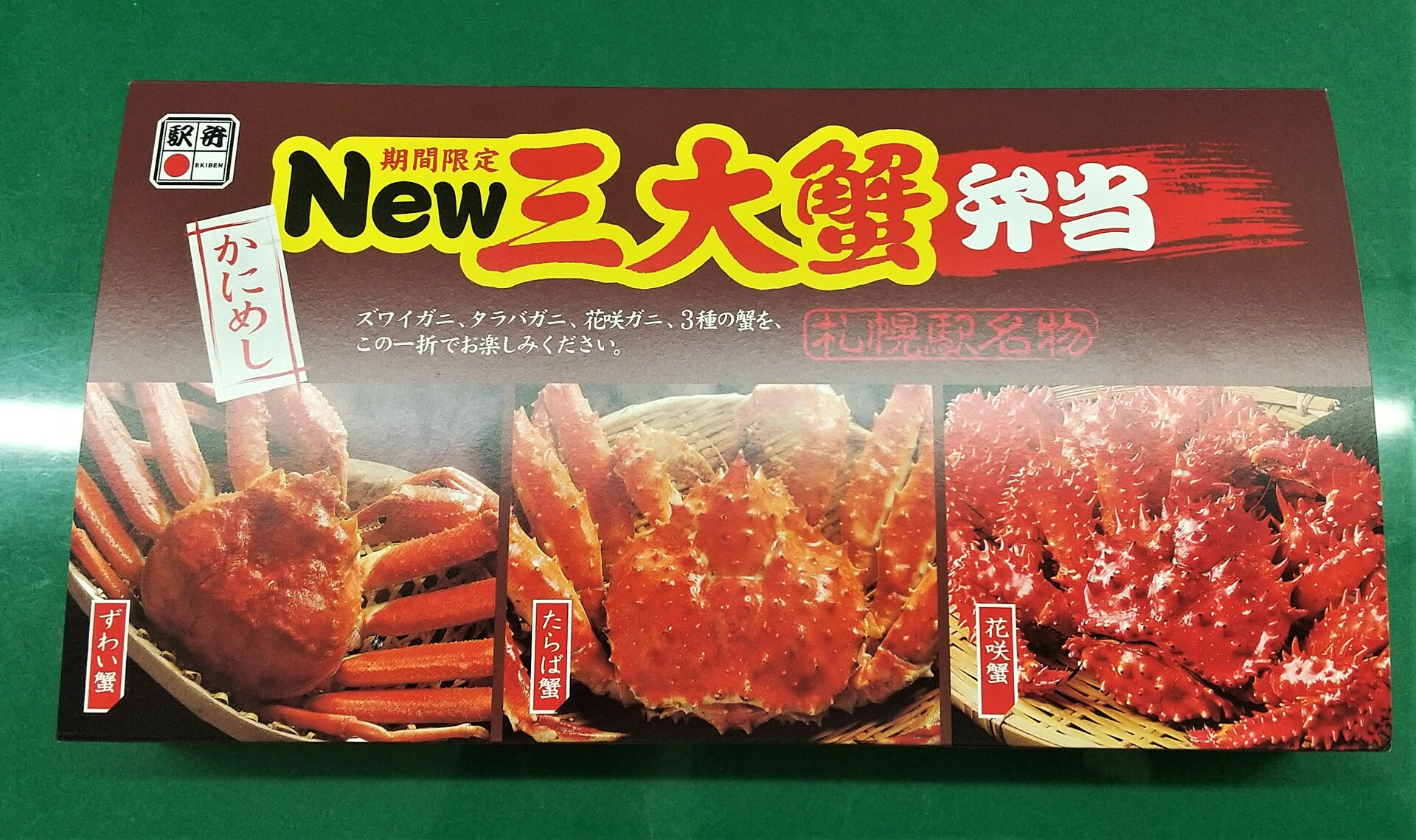 記念日だから奮発しちゃおうと、私は「かにめし」「札幌駅名物」という二枚看板的副題までついた「期間限定 New 三大蟹弁当」を買った(↓ ピンボケをお許し願いたい)。