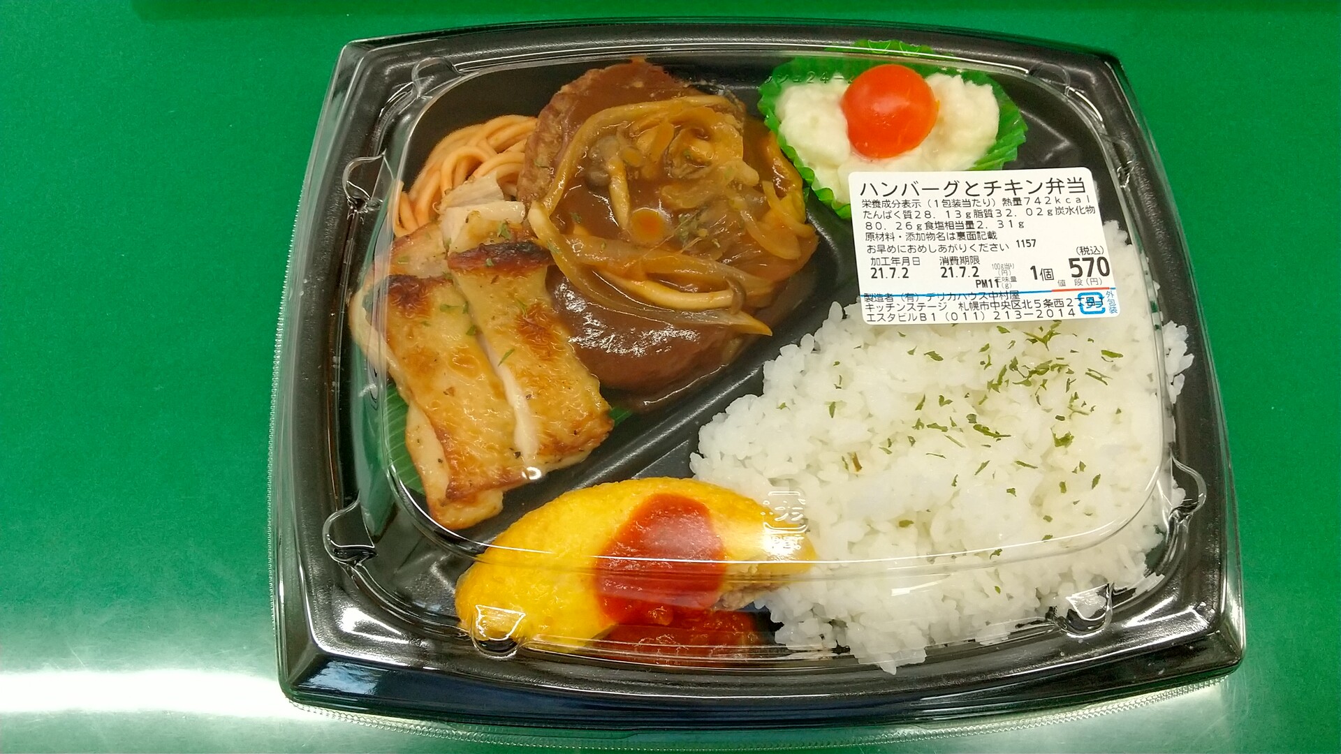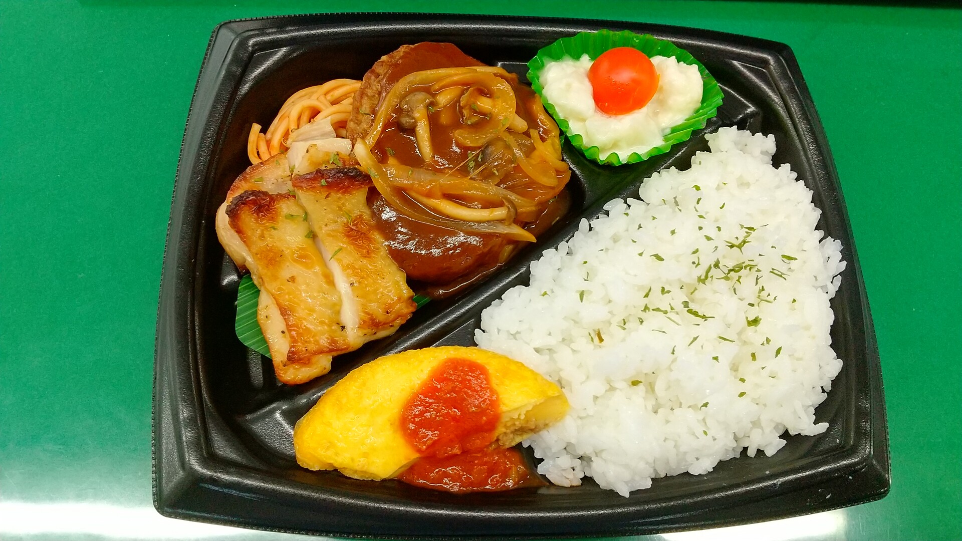 この弁当はひじょうにレベルが高い。ハンバーグのデミソースなんか本格的だ。ただ、ちょっと塩分が強い感じが……。それ以外は私としては満点だ(チキンもオムレツもポテサラも洋食屋の味!)。「コックさんありがとう!」。そう思いながら「サラメシ」風に、作ってくれた人(おばちゃんかもしれないけど)に感謝しながら食べた。