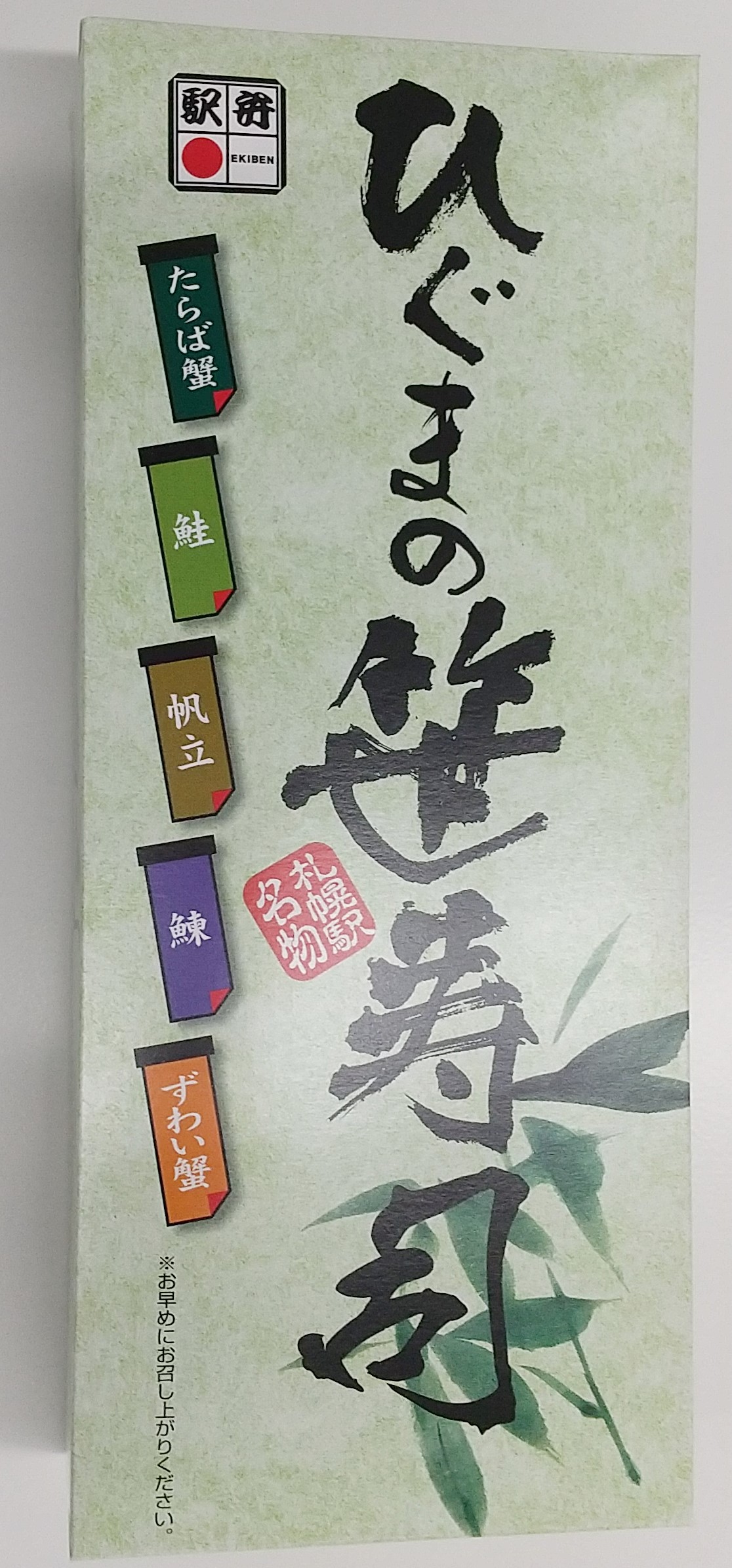 で、駅弁の「おすし」にしようかと思ったが、駅弁売り場で初めて「ひぐまの笹寿司」(1,100円)を目にしたので、高い昼ご飯になるなぁ。でも明日から4日間は休日で昼食代はかからないから今日を入れて5日間で1,100円だから1日当たり220円か、とワケのわからない納得をし、購入した。