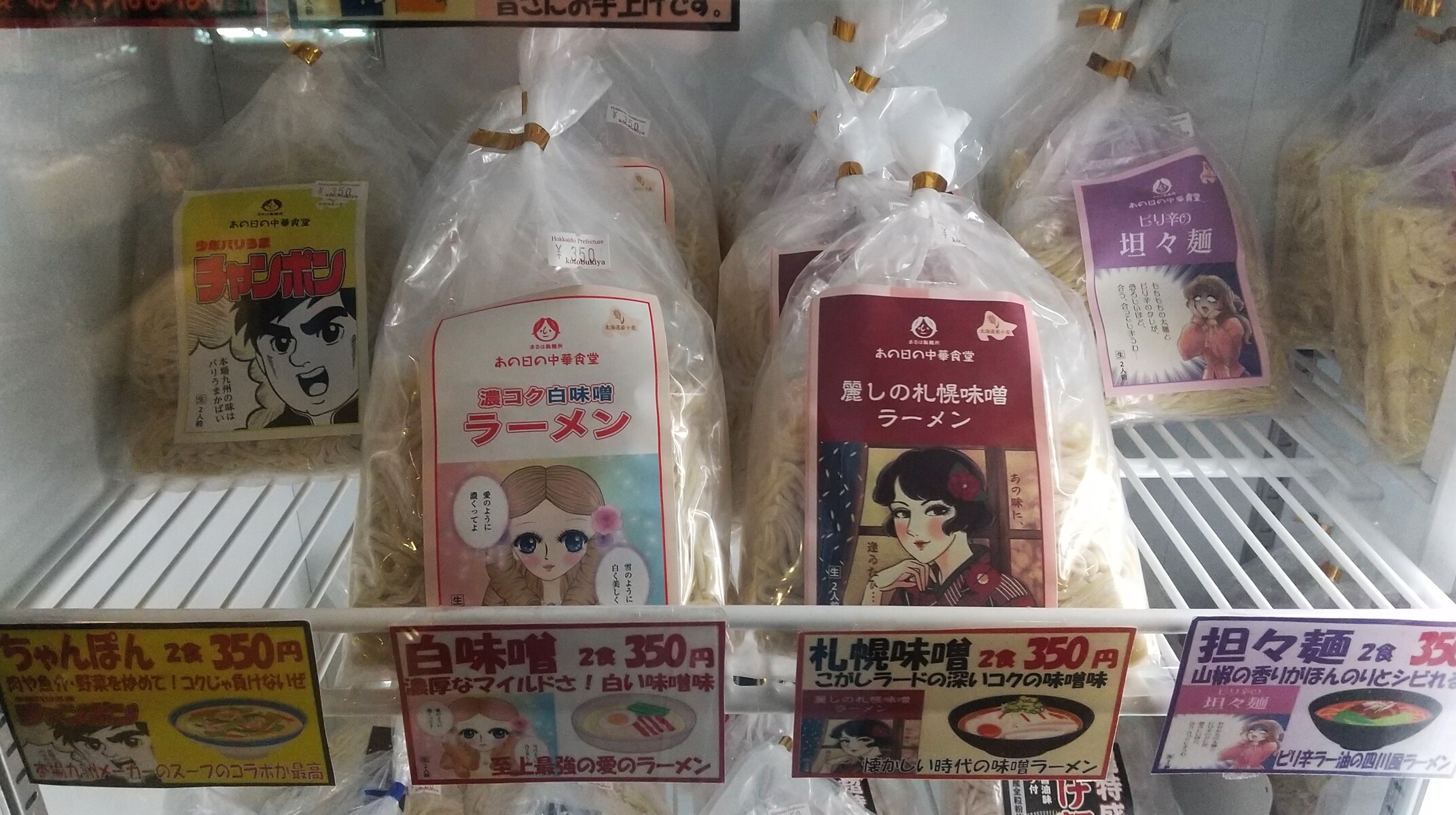 「えぶり市場」には「ことぶきや」のほか「おいで屋」と「まちのやおやさん」の3店が所狭しと商品を陳列。他ではあまり見かけないマニアックなものも多い(ヘンテコな生麺(写真。恵庭の「まるは製麺所」というところの商品)や四国の地域限定カップ麺なんかも置いてあった)。