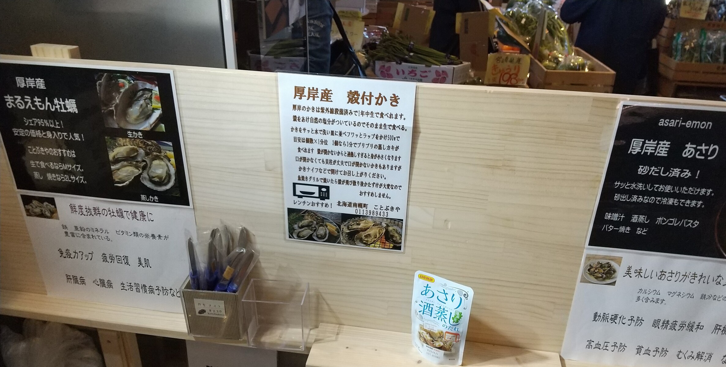それもそのはず。「ことぶきや」は建物内の「えぶり市場」の中で物販もしていて、カキやアサリなどの海産物を扱っている。新鮮さが違うのだ。