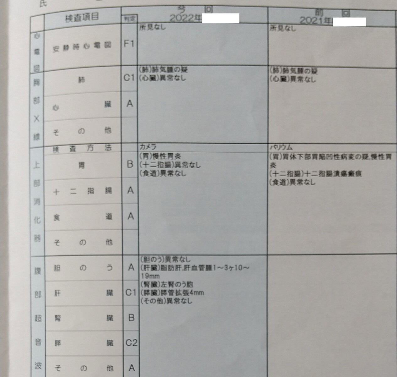 過去に指摘された脂肪肝、肝血管腫(こちらは数年ぶり)、左腎のう胞は今回も常連の地位を譲っていなかった。ただ、おととしの検査で指摘された胆のう腺筋症は、今回認められなかった。