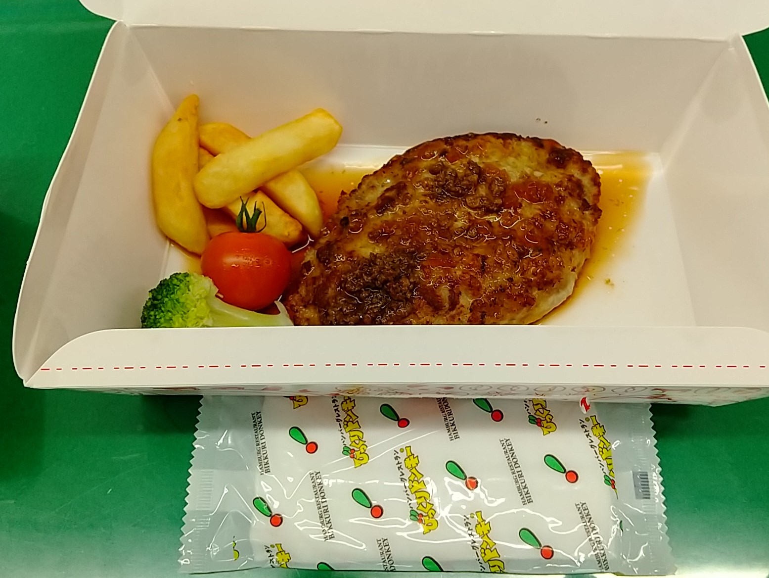 昼までじっとがまんし(その間、私のおなかの中にはコオロギがいるのかってくらい、おなかが鳴った)、12時ジャストにソース容器を取り出したあと、会社内にある電子レンジで温め、久々のドンキーバーグを口に入れた。