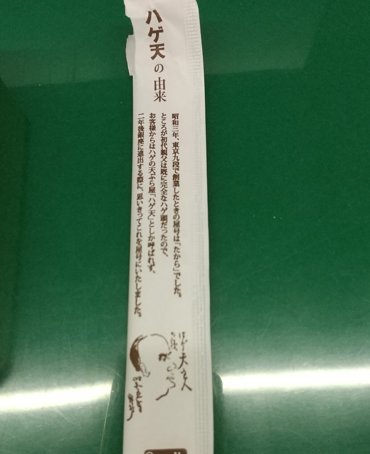 なお、箸袋の裏には「ハゲ天」の名前の由来が。なお、帯広の「HAGETEN」は「ハゲ天」ではなく「はげ天」である。