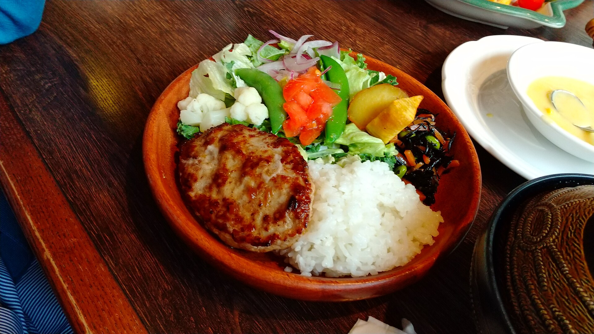 私は「レギュラーバーグディッシュ150g」。200gの「レギュラーバーグステーキ」とライスにしようかとも迷ったが、せっかくお孫ちゃんに遊んでもらうために来ているのに食べ過ぎにっておなかをこわしては元も子もないと、150gでがまんした。妻は「いろどりディッシュレギュラー」の100g。お孫ちゃんのお母さんは私と同じく「レギュラーバーグディッシュ150g」。そしてお孫ちゃんは「ぶ~ちゃんのおこさまランチ」にした。
