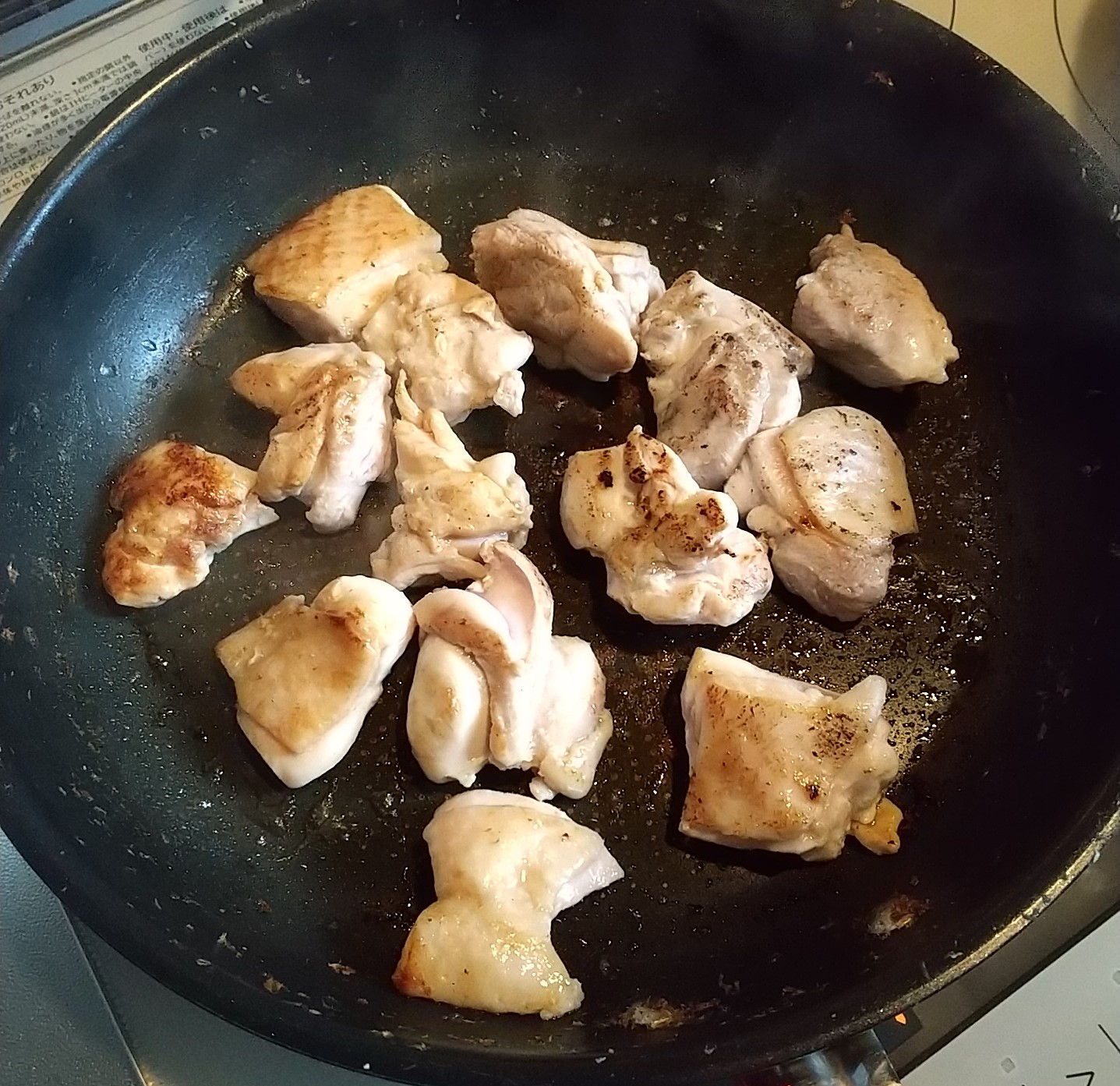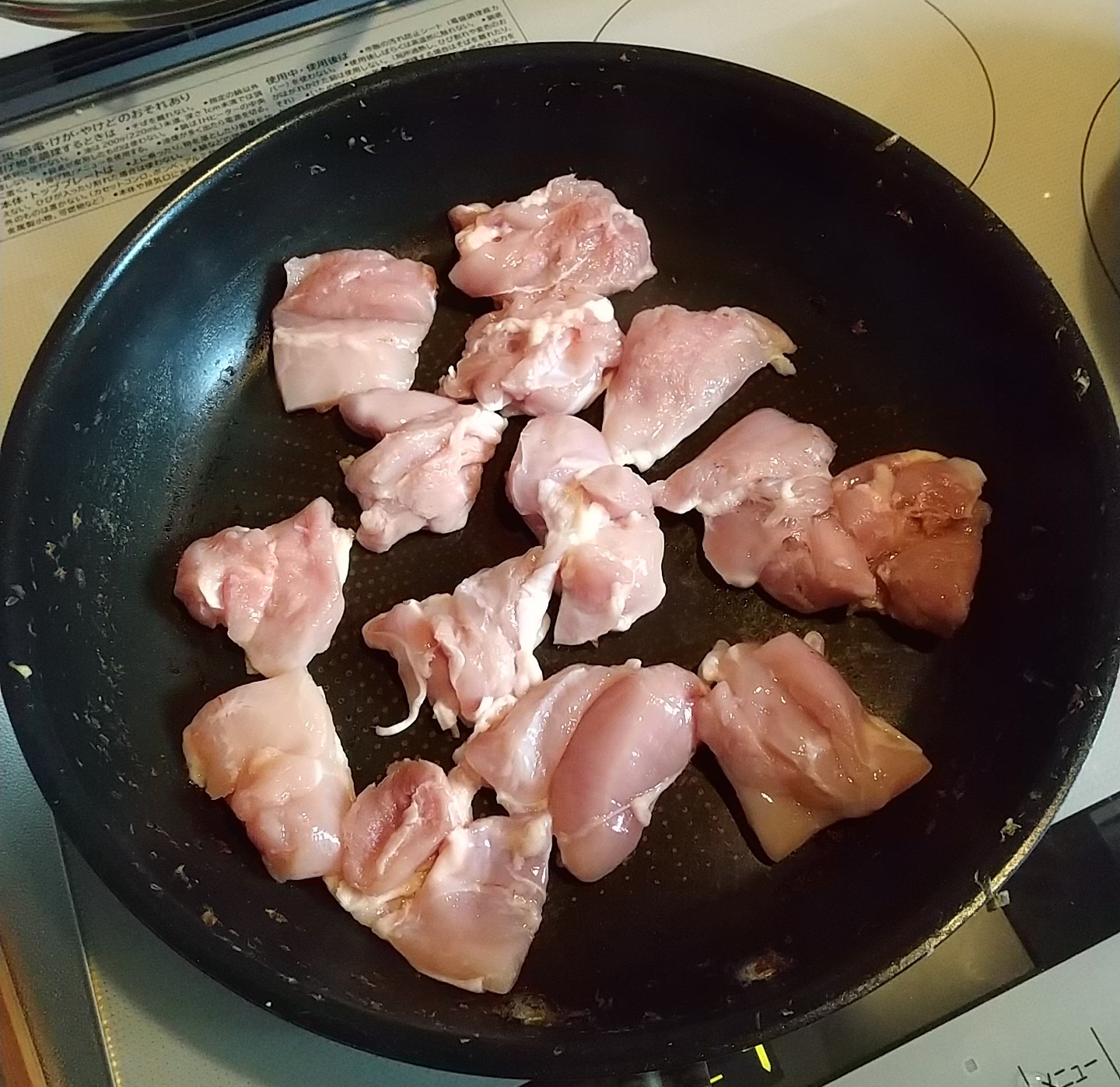 炒めたタマネギを別な鍋に移し、鶏肉を焼く。油はひかなかった。