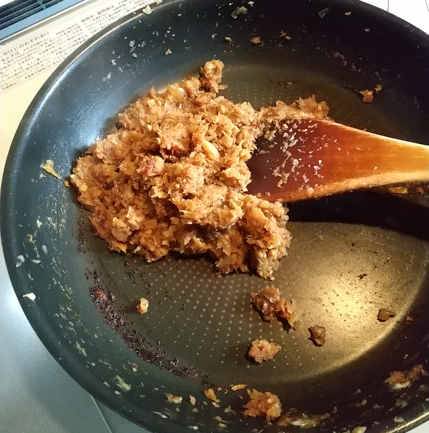 ・フライパンにオリーブオイルを入れ、弱火でみじん切りにしたニンニクとショウガを2分ほど炒める。これは印度カリー子の本「ひとりぶんのスパイスカレー」に載っているやり方に忠実に従っている。