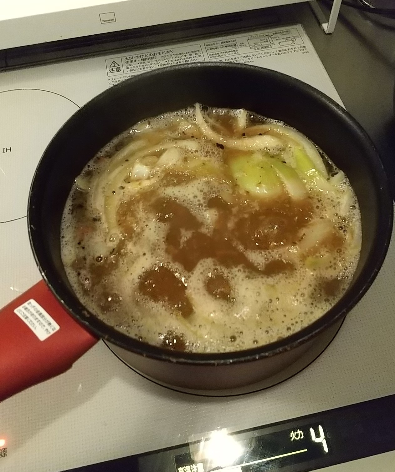 ・沸騰した様子。このあとアクをとり、さらに煮込む。タマネギをあれだけ炒めたので、ルーを入れる前なのに、すでにカレーのような色をしている。
