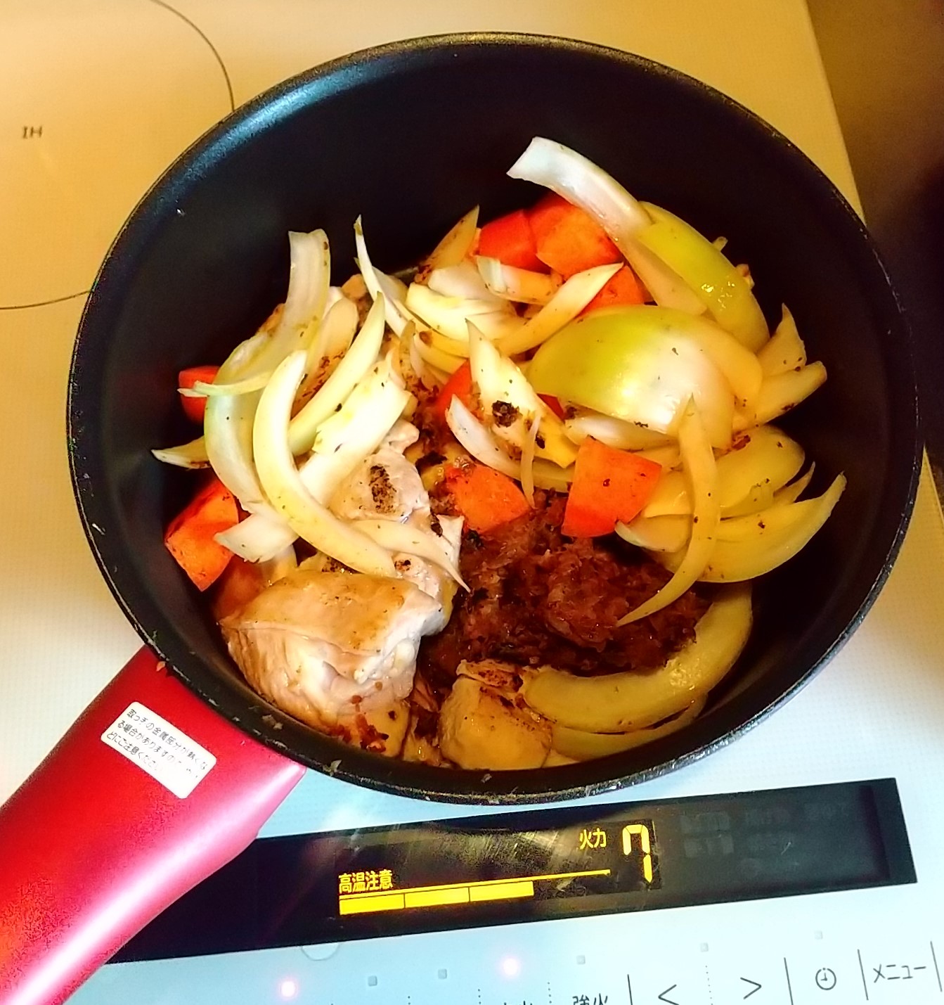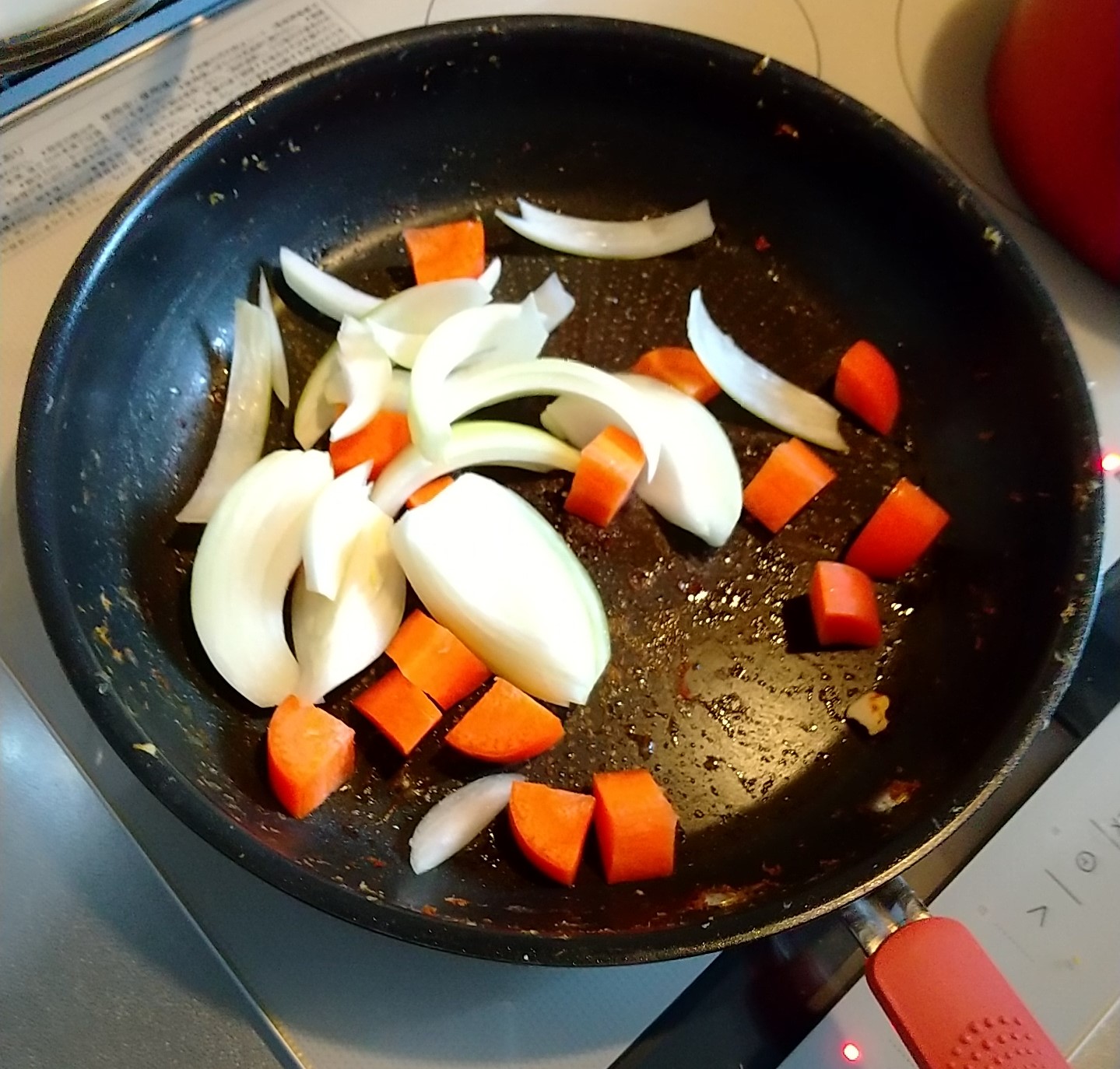 鶏肉をタマネギの鍋に移し、ニンジンと食感を味わうためにくし切りにしたタマネギ(半個)を軽く炒める(油は鶏肉から出たものだけで、新たには加えない)。