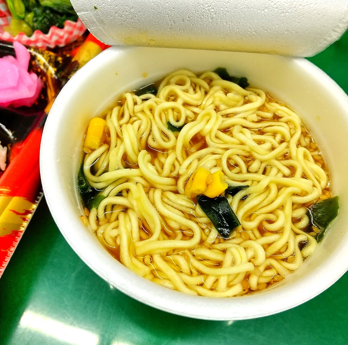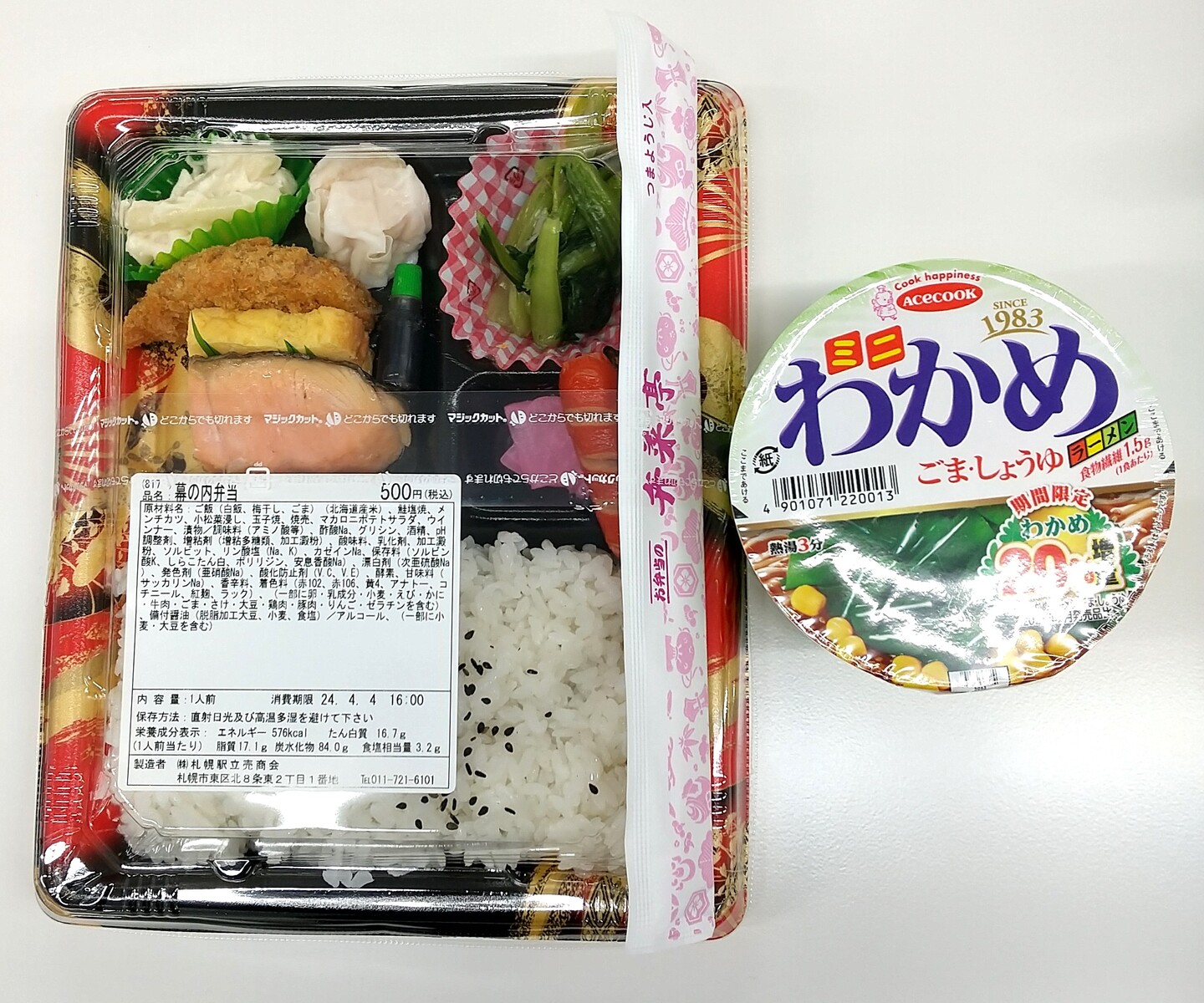 無謀にもお供にはファミリーマートで買った「ミニわかめラーメン ごま・しょうゆ」(153円)を任命した。「わかめラーメン」はあまり食べたことがなかったが、おいしかった。