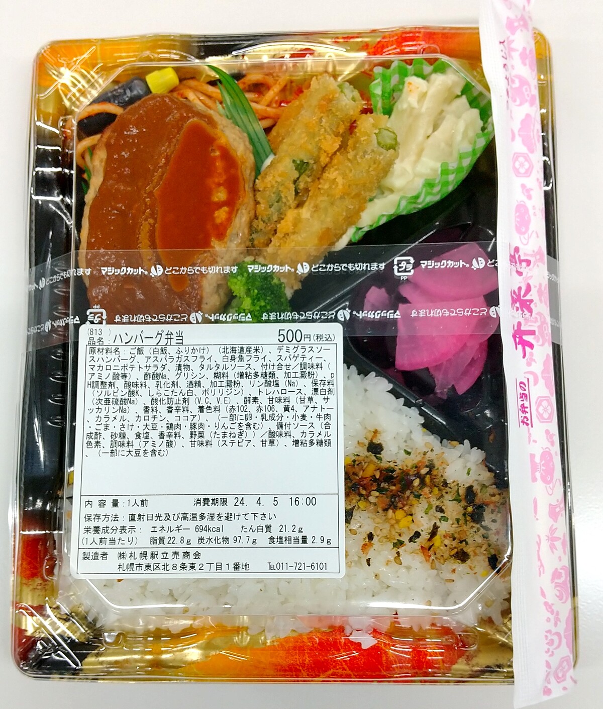 札幌駅西改札前の弁菜亭のワゴンに行ったのは、8時25分ころだったが、なんと「ハンバーグ弁当」は残り1個だった。売り子さんが「最後です」と言ったので、ワゴンの下にまだ隠してあるってことはないだろう。ゲットできて、なんだか気分が高揚した。