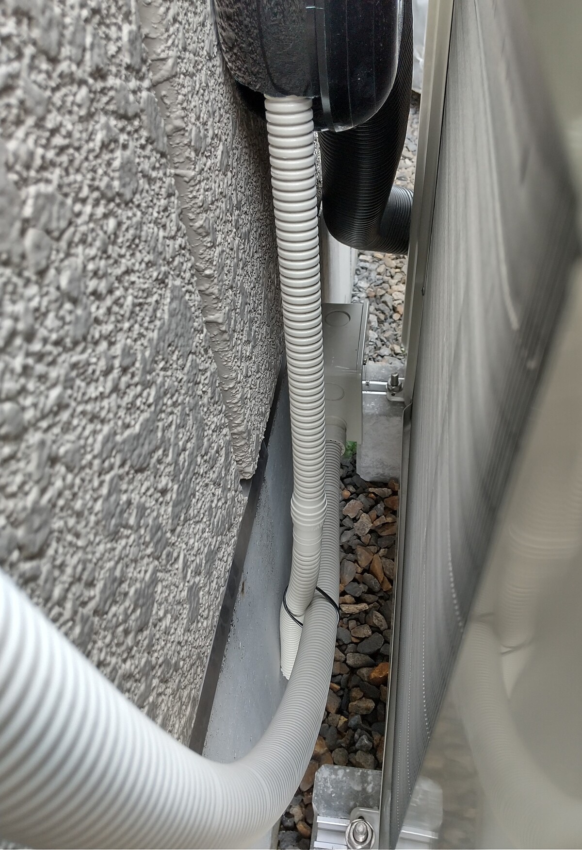 そして、2階ベランダに置かれた室外機の近くでカバー内へと合流し、室内へ。