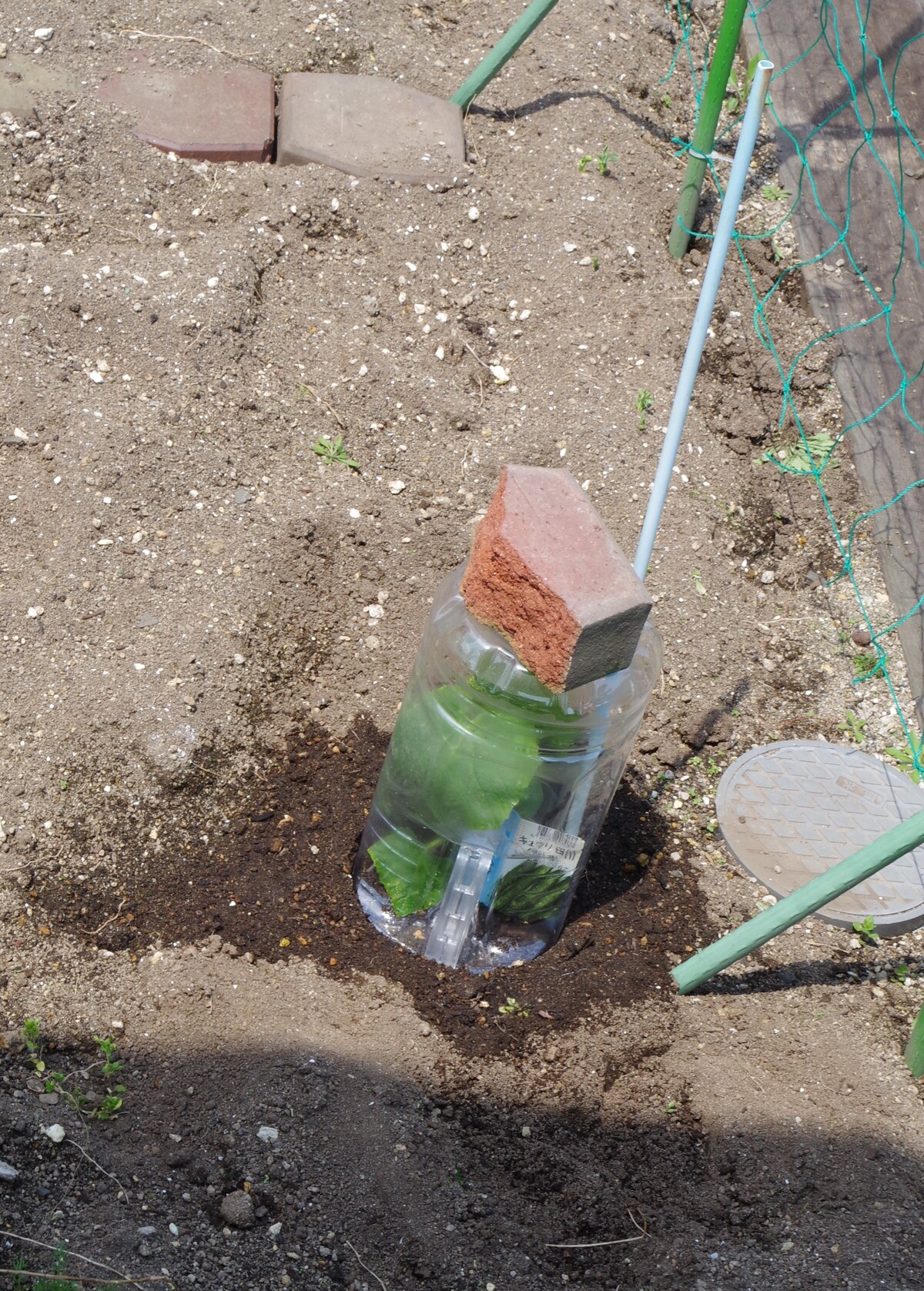 今年もミニトマトは奇をてらわずに品種は「アイコ」。中玉トマトはやめて大玉に(品種不明)。あとはナスとピーマン(品種不明)。豊作だったが食べきれなかったシシトウも今年はやめた。特に苗が良くなかったキュウリは、価格が高い接木苗(品種は四川)の方を買った(キュウリは特別に、ビニールで囲うのではなくペットボトル-ブラックニッカクリアの4リットルボトル-で作った『温室』で育てることにした)。