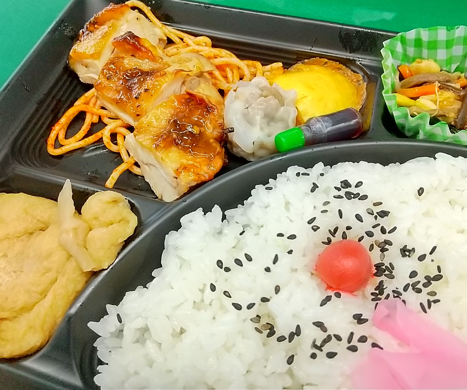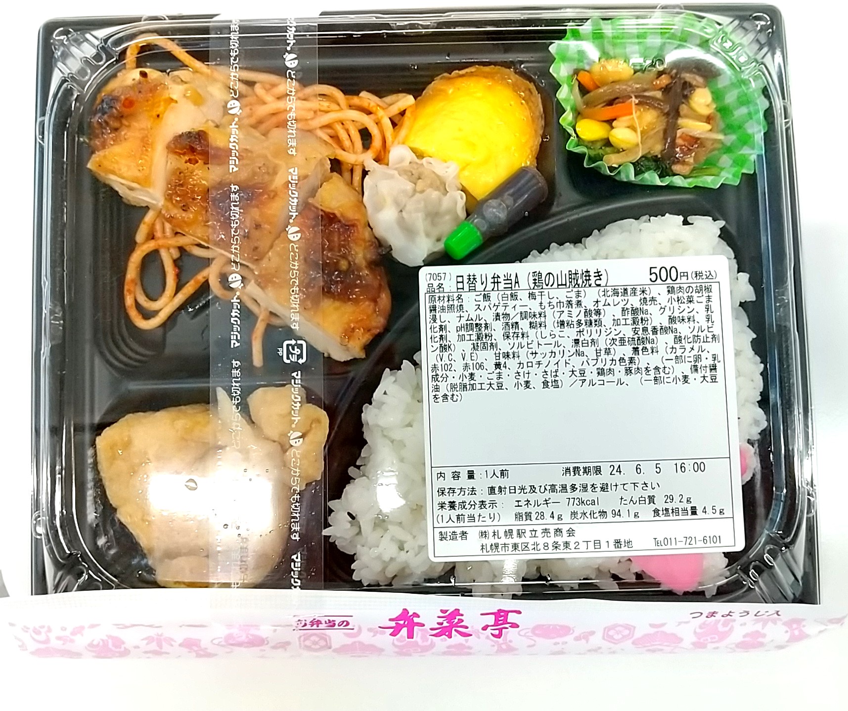 札幌駅西改札前の弁菜亭ワゴンに、6月(水無月)の「今月のおすすめ弁当」はどんなのかな?と見に行ったが「今月のおすすめ弁当」の姿は無く、でもまだ8時半前だというのにすでに「日替わり弁当」が入荷していて(ただし『A』のみ)、しかもそのメインのおかずが鶏肉を焼いたものときた日にゃ、チキンフェチ、いや、チキンファンの私としては買わないわけにはいかない。ってわけでこのワンコイン弁当を歓びに打ち震えながら買った。