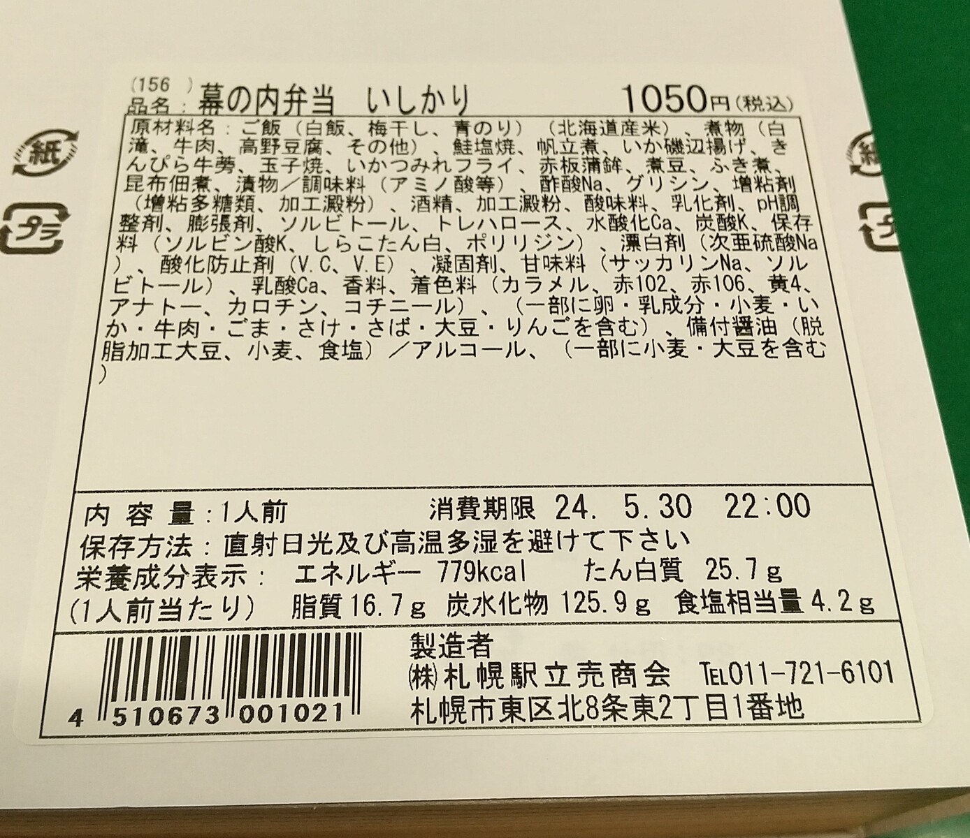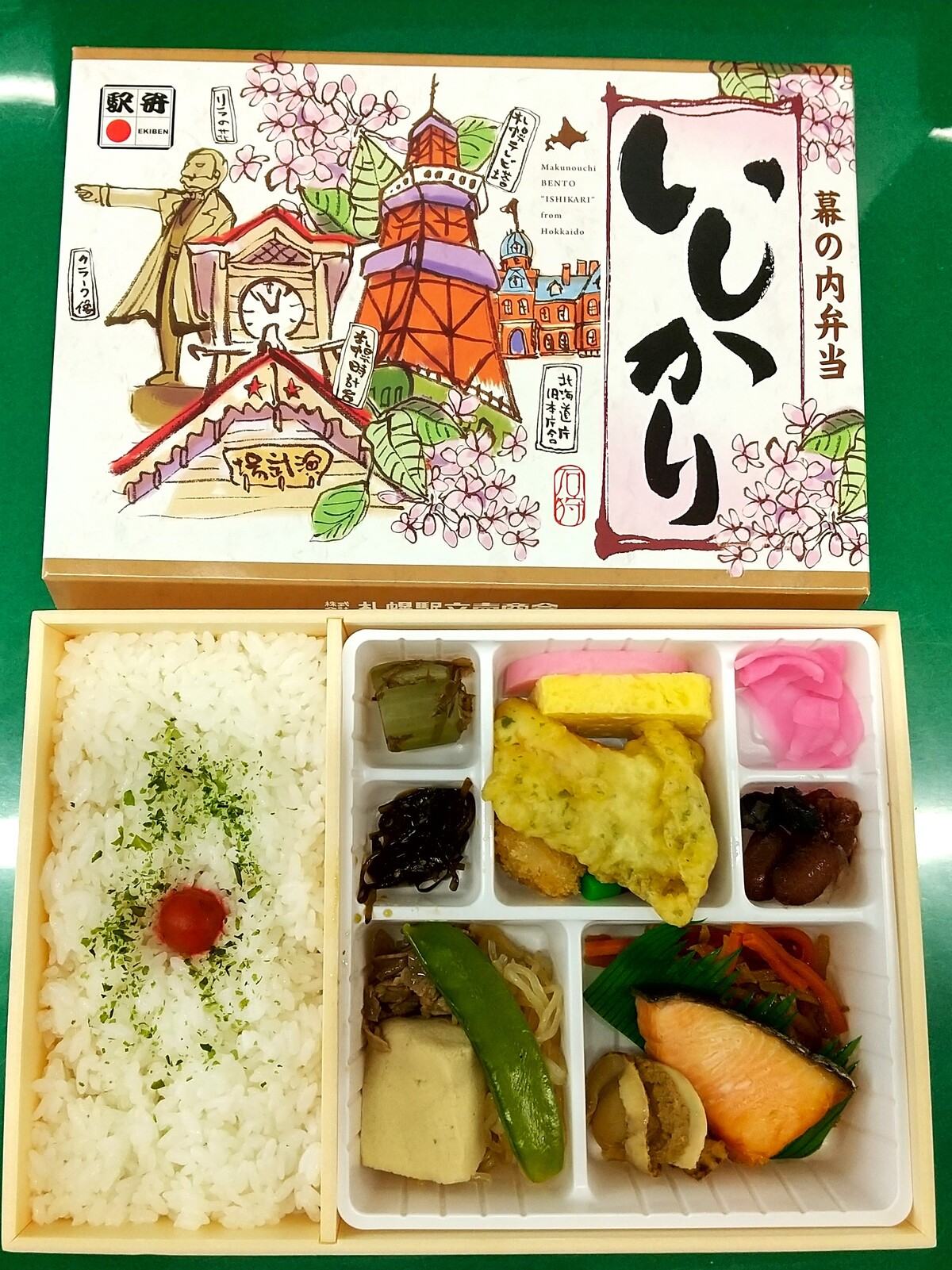 先週の木曜日は旅行後最初の出社日だったが、昼はタイトルのとおり、札幌駅立売商会(弁菜亭)の「幕の内弁当 いしかり」を朝のうちに買って(@西改札前の弁菜亭ワゴン)食べた。