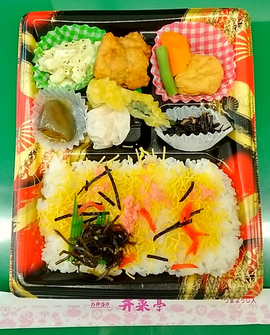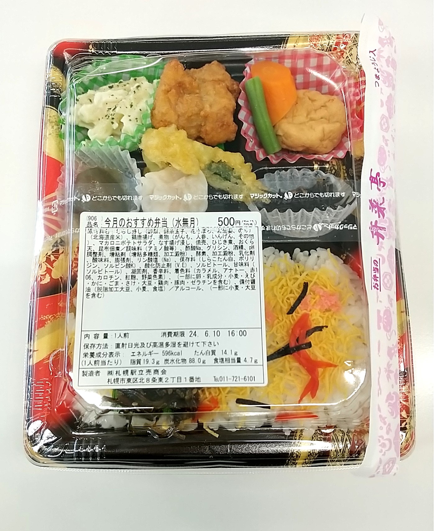 月曜日も、いつものように朝、西改札前の弁菜亭ワゴンで弁当を購入。この日の昼用に買ったのは「今月のおすすめ弁当(水無月)」。