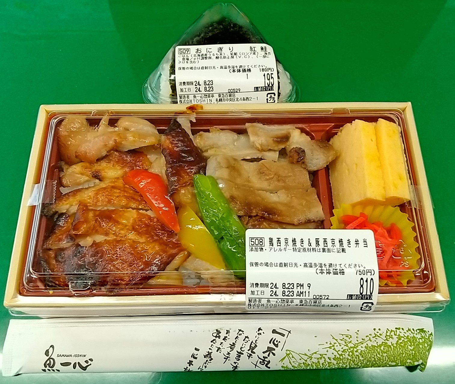 その途中に東急百貨店の地下に寄り「魚一心 惣菜亭」を覗くと、いつも私が見に行くよりも遅い時間の、もう11時を過ぎていたせいか、久しぶりに「鶏西京焼き&豚西京焼き」弁当の姿を発見。もちろんゲット。さらに紅鮭のおにぎりもここで購入。なんせ前日の21時以降絶食しているのだ。これくらい食べないと夏バテしてしまう。