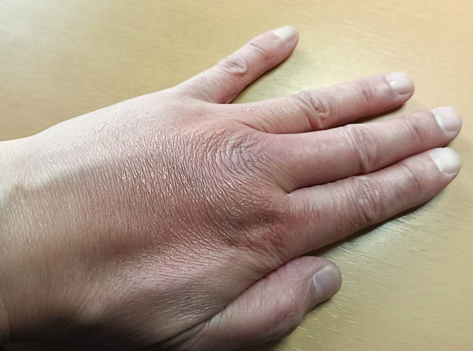 蜂に刺されたためと思われる左手中指と人指し指のつけ根の手の甲の腫れと痛み。