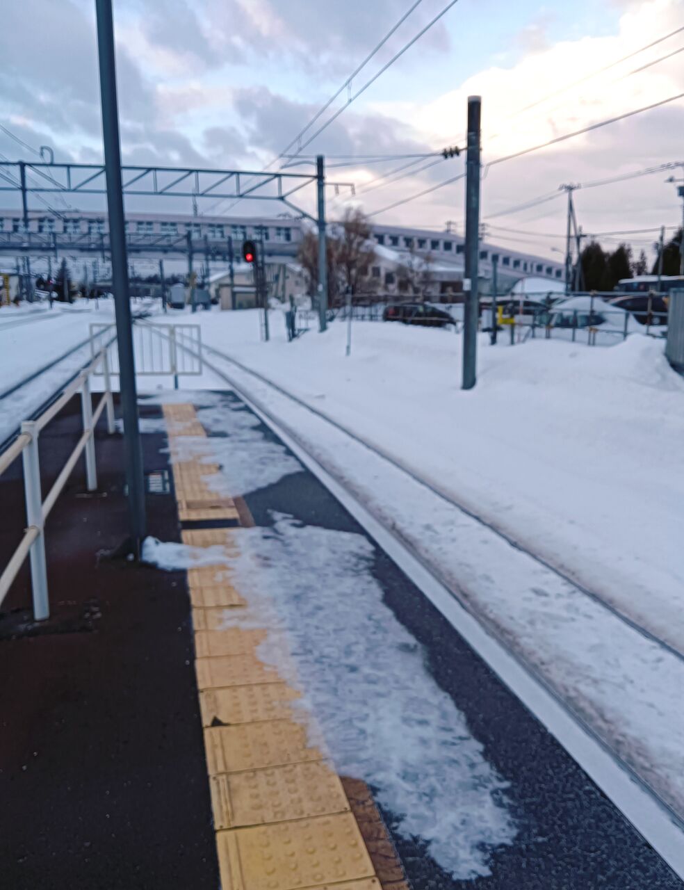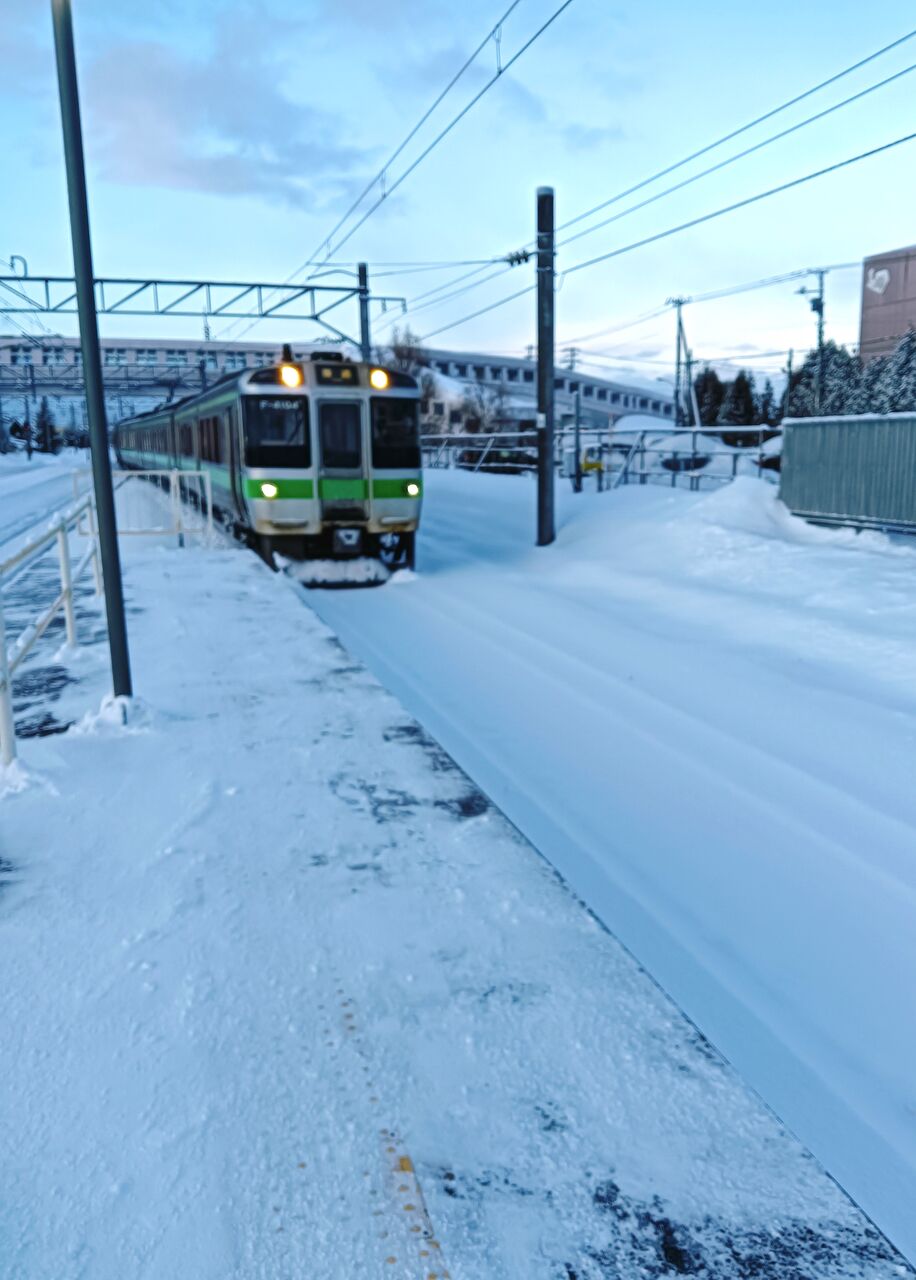ホームの写真を見ると、前日から雪が増えているのがおわかりになるだろう。なお、写真がぶれているのは、まだ薄暗いせいである。