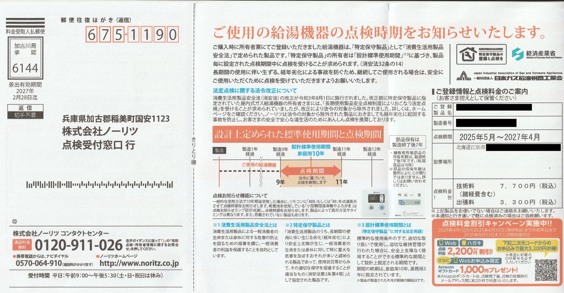 今回の点検期間は2027年4月までだが、そんな経験から、どうせ点検するなら早くやっておいた方が良いだろうと私はそう考えた。今年の6月30日までに申し込んで、8月31日までに点検を実施すると割引キャンペーンの対象になるし……
