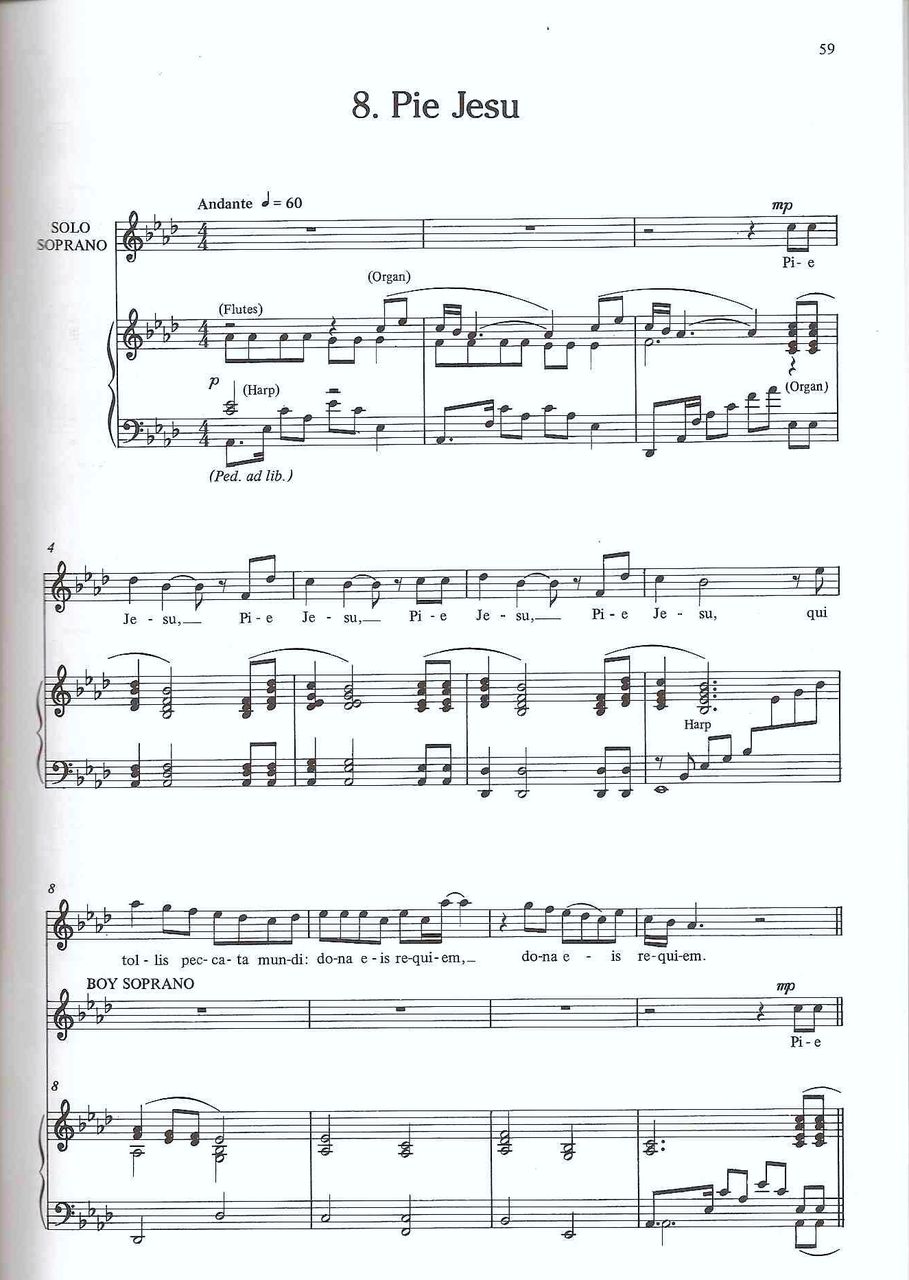 極めて美しい“ピエ・イエス”(掲載譜。HAL・LEONARD社刊のヴォーカル・スコア)が特に有名で単独でも演奏されるが、ぜひとも全曲を聴いておきたい傑作だ。