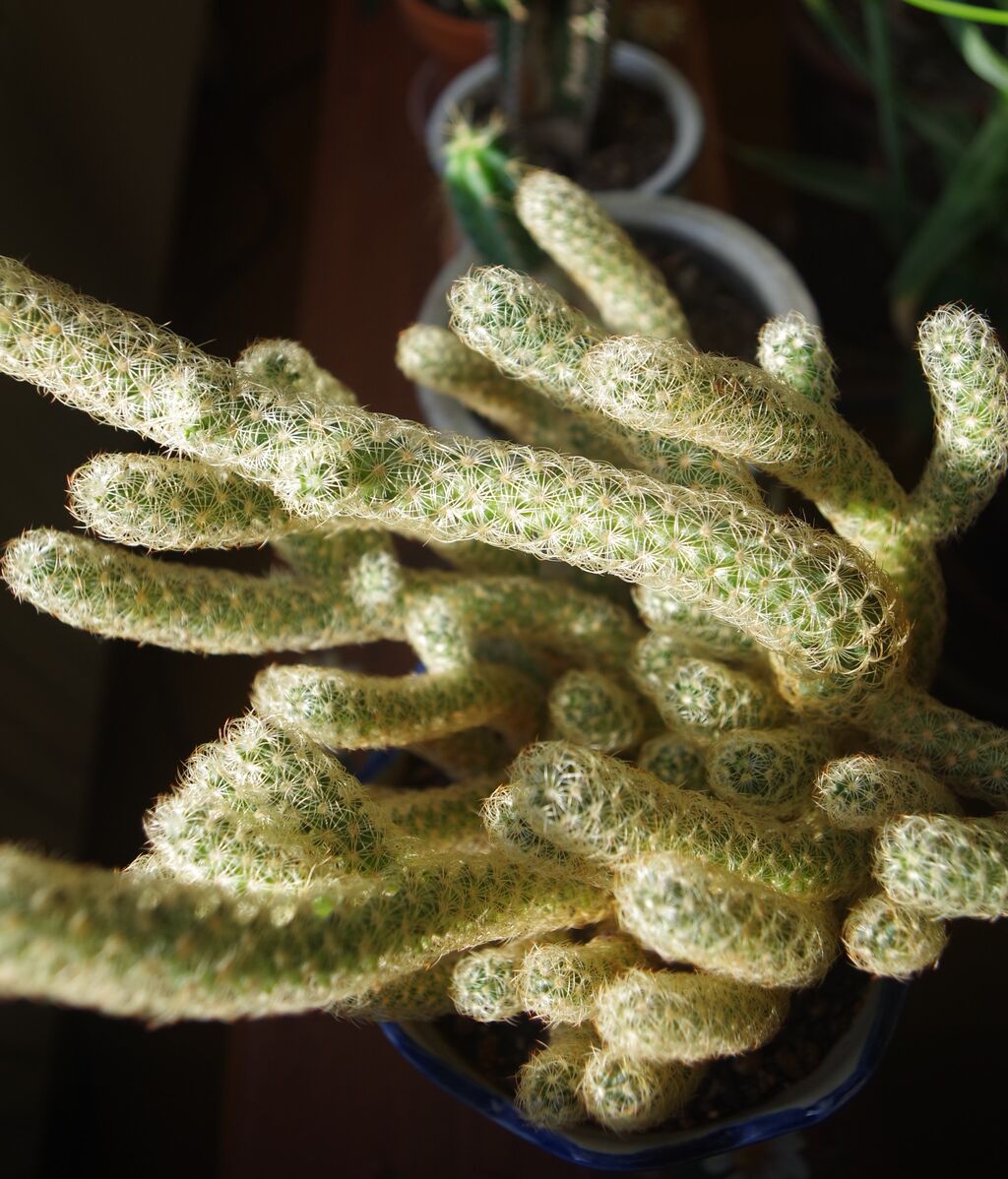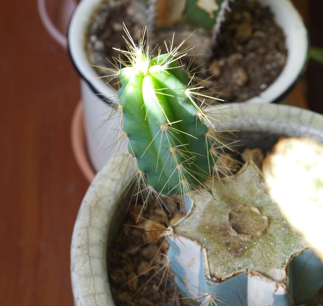 私の部屋ー厳密には長男の部屋ーに置いてある柱サボテンの(おそらくその名は)アズレウスが新たな芽(枝)を出してくれて、その色合いが新緑の季節を思い起こさせる(生長すると灰色がかった青緑色=青磁色になる)。なんてったって、その姿がかわいい!