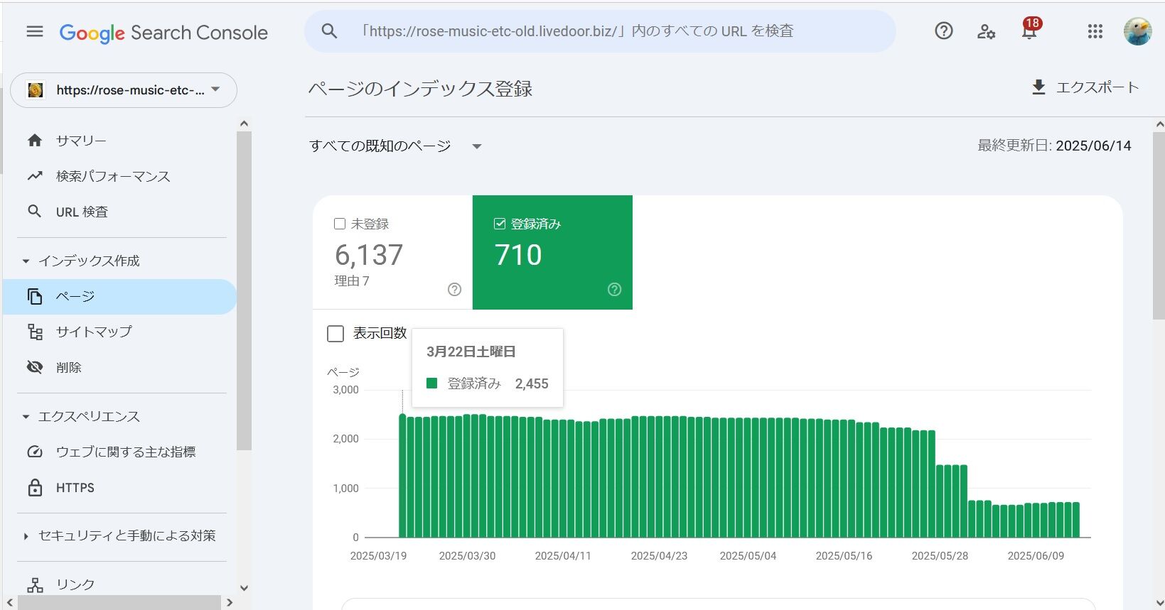 5月28日から減り始めており、6月14日現在でインデックスされているのは本館で710ページ、新館で1,902ページ。