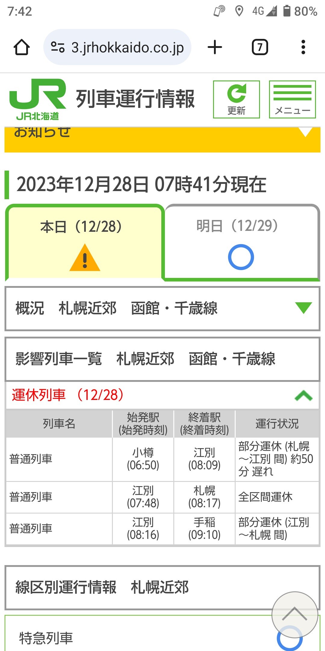 JR の運行情報の『各駅運行情報』の札幌駅(岩見沢方面)を見ても、『X』印がついた列車は一つもなかった(すでに21時以降は運休とアナウンスしているにもかかわらず)。